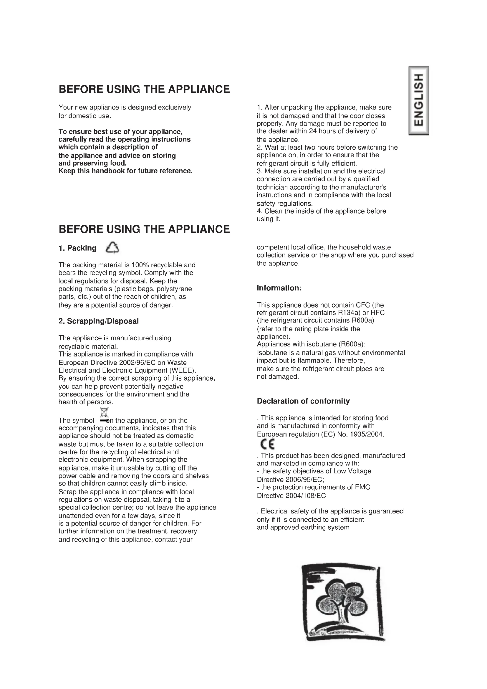 CAUTION: At the end of the function life of the appliance it must be disposed in accordance with the W.E.E.E directive (See below). You appliance contains R600a refrigerant and inflammable gas in the insulating foam.