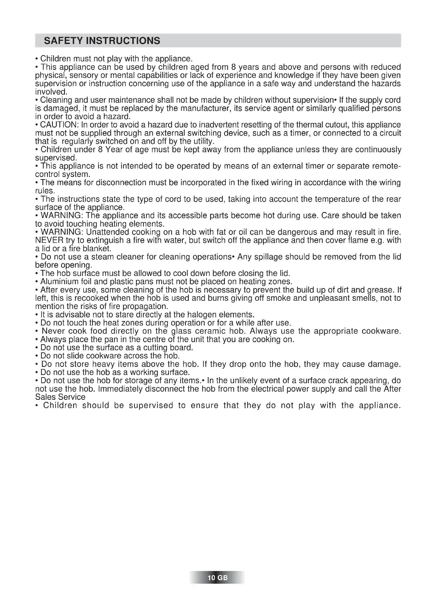 - Do not use the hob for storage of any items.• In the unlikely event of a surface crack appearing, do not use the hob. Immediately disconnect the hob from the electrical power supply and call the After Sales Service