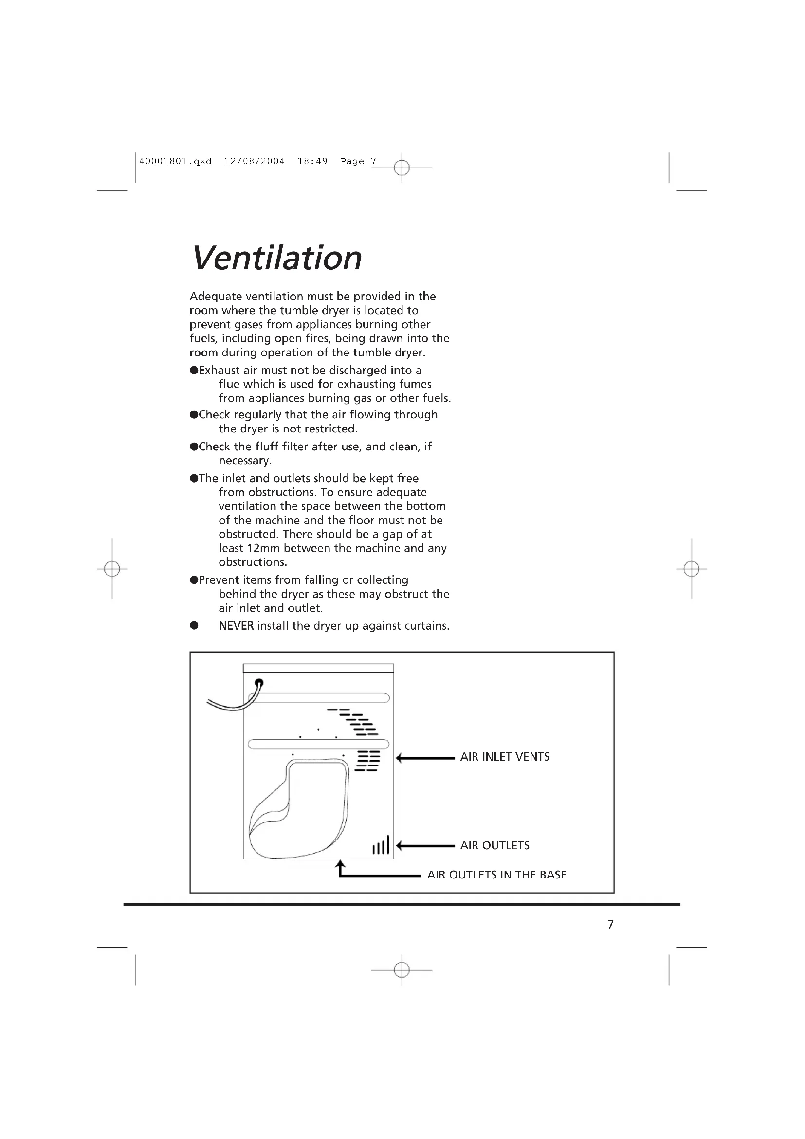 40001801.qxd 12/08/2004 18:49 Page 7Before using the tumble dryer for the first time: ● Please read this instruction book thoroughly. ● Remove all items packed inside drum. ● Wipe the inside of the drum and door with a damp cloth to remove any dust which may have settled in transit. CCllootthheess pprreeppaarraattiioonn Make sure that the laundry you are going to dry is suitable for drying in a tumble dryer, as shown by the care symbols on each item. Check that all fastenings are closed and that pockets are empty. Turn the articles inside out. Place clothes loosely in the drum to make sure that they don't get tangled. MMaaxxiimmuumm ddrryyiinngg wweeiigghhtt ● Cottons Max. 7 kg ● Synthetics Max. 3.5 kg