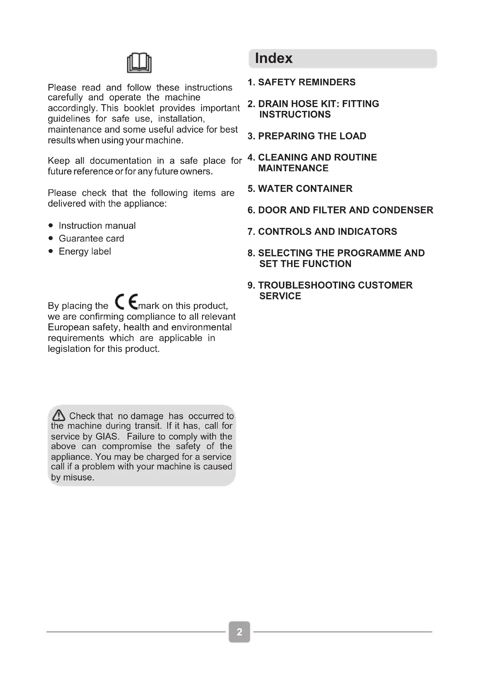 3. PREPARING THE LOAD4. CLEANING AND ROUTINE MAINTENANCE5. WATER CONTAINER6. DOOR AND FILTER AND CONDENSER7. CONTROLS AND INDICATORS 8. SELECTING THE PROGRAMME AND SET THE FUNCTION9. TROUBLESHOOTING CUSTOMER SERVICEDRAIN HOSE KIT: FITTING INSTRUCTIONSPlease read and follow these instructions carefully and operate the machine accordingly. This booklet provides important guidelines for safe use, installation, maintenance and some useful advice for best results when using your machine. Keep all documentation in a safe place for future reference or for any future owners. Please check that the following items are delivered with the appliance:● Instruction manual● Guarantee card● Energy labelBy placing the mark on this product, we are confirming compliance to all relevant European safety, health and environmental requirements which are applicable in legislation for this product.Check that no damage has occurred to the machine during transit. If it has, call for service by GIAS. Failure to comply with the above can compromise the safety of the appliance. You may be charged for a service call if a problem with your machine is caused by misuse.1. SAFETY REMINDERS This appliance can be used by children aged from 8 years and above and persons with reduced physical,sensory or mental capabilities or lack of experience and knowledge if they have been given supervision or instruction concerning use of the appliance in a safe way and understand the hazards involved.Children shall not play with the appliance. Cleaning and user maintenance should not be made by children without supervision.Children of less than 3 years should be kept away unless continuously supervised. WARNING Misuse of a tumble dryer may create a fire hazard. This appliances is intended to be used in household and similar applications such as: A different use of this appliance from house hold environment or from typical housekeeping functions,as commercial use by expert or trained users, is excluded even in the above applications. manner inconsistent with this it - Staff kitchen areas in shops , offices and other working environments; - Farm houses; - By clients in hotels, motels and o t h e r r e s i d e n t i a l t y p e environments; - Bed and breakfast type environments. If the appliance is used in a may reduce the life of the appliance and may void the manufacturer’s warranty. Any damage to the appliance or other damage or loss arising through use that is not consistent with domestic or household use ( even if located in a domestic or household environment) shall not be accepted by the manufacturer to the fullest extent permitted by law. This machine should only be used for its intended purpose as described in this Do not touch the appliance when hands or feet are damp or wet. Do not lean on the door when loading the machine or use the door to lift or move the machine. Do not allow children to play with the machine or its controls. manual. Ensure that the instructions for installation and use are fully understood before operating the appliance.