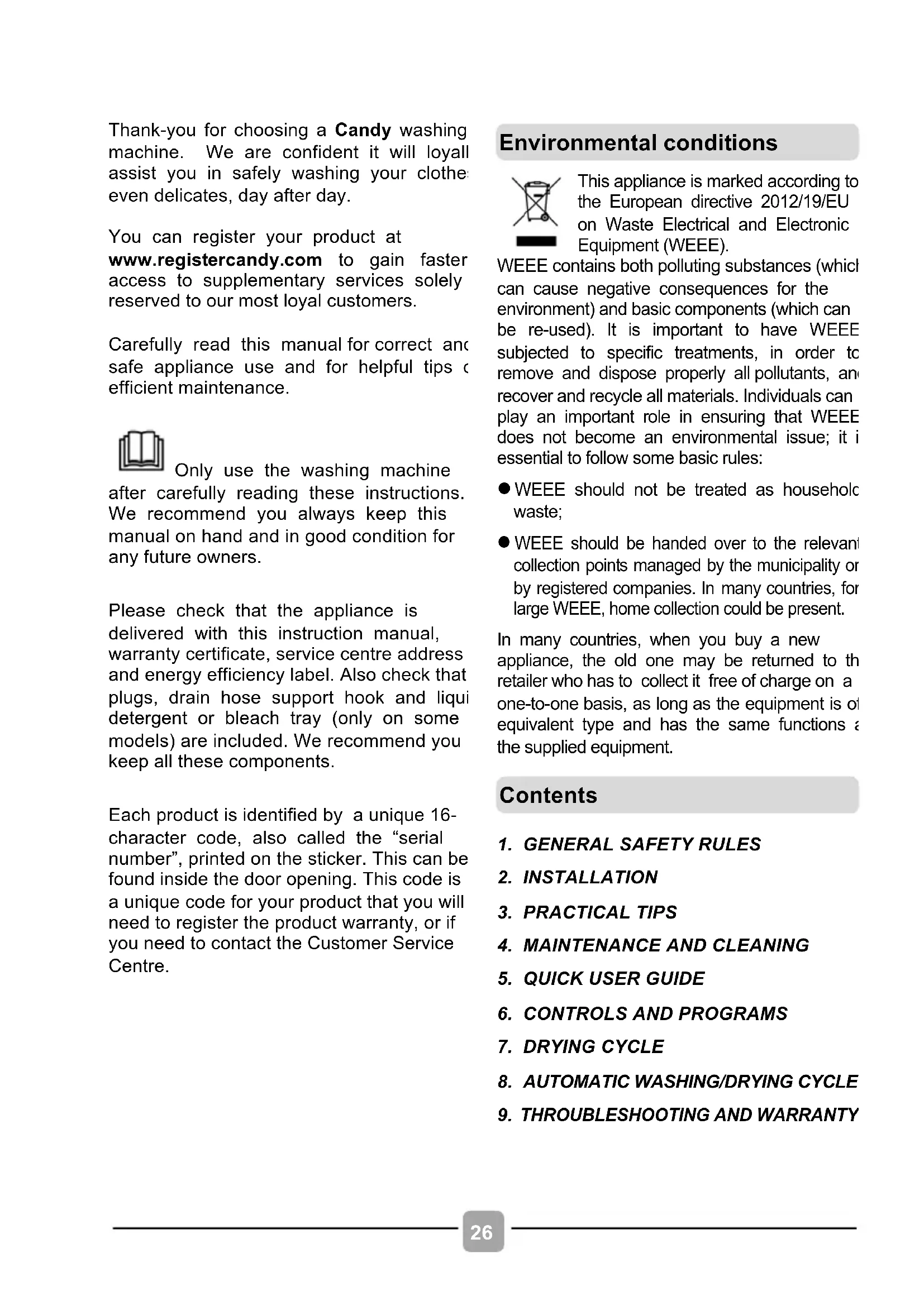 Thank-you for choosing a Candy washing machine. We are confident it will loyally assist you in safely washing your clothes, even delicates, day after day. You can register your product at www.registercandy.com to gain faster access to supplementary services solely reserved to our most loyal customers. Carefully read this manual for correct and safe appliance use and for helpful tips on efficient maintenance. Only use the washing machine after carefully reading these instructions. We recommend you always keep this manual on hand and in good condition for any future owners. Please check that the appliance is delivered with this instruction manual, warranty certificate, service centre address and energy efficiency label. Also check that plugs, drain hose support hook and liquid detergent or bleach tray (only on some models) are included. We recommend you keep all these components. Each product is identified by a unique 16- character code, also called the “serial number”, printed on the sticker. This can be found inside the door opening. This code is a unique code for your product that you will need to register the product warranty, or if you need to contact the Customer Service Centre.