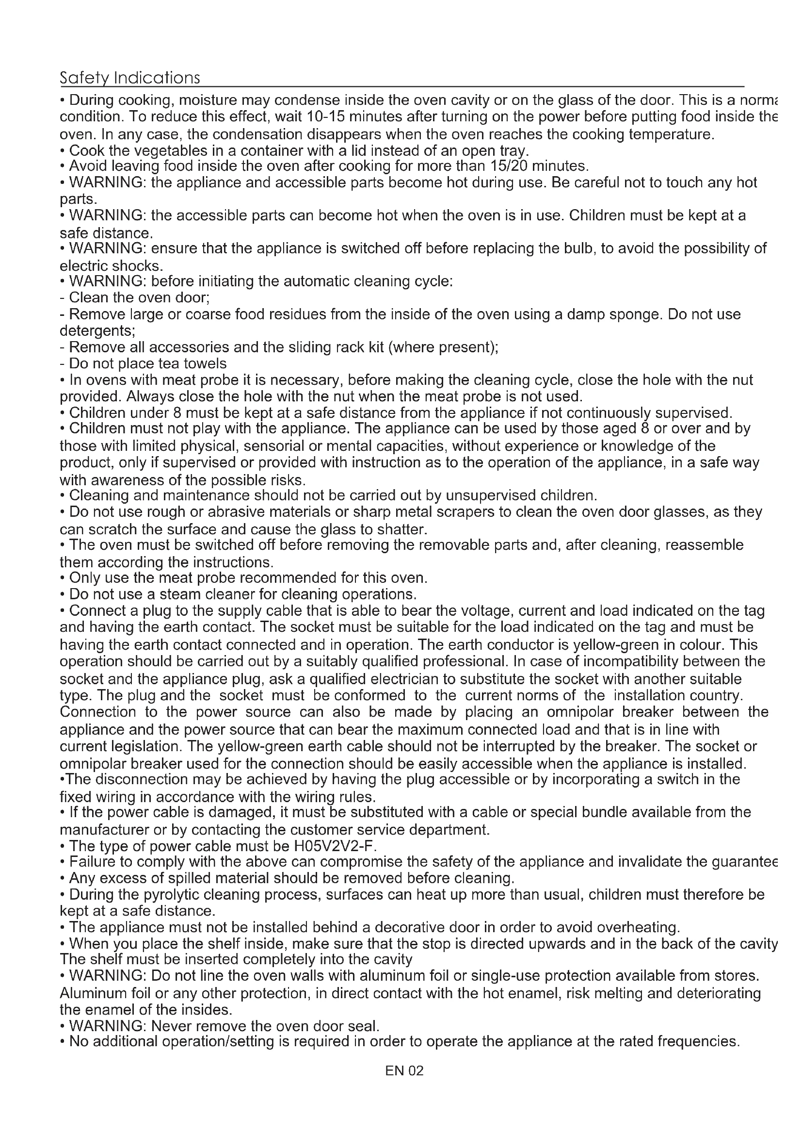 - After replacing the defective bulb, screw back the protective glass cover. Special self-cleaning panels covered in a micro-porous coating are available as optional extras for all models. If they are fitted, the oven no longer needs to be cleaned by hand. The fat that is splattered onto the sides of the oven during roasting is eliminated by the microporous coating which breaks the fat down by catalysis and transforms it into gas. Excessive splattering may nevertheless block the pores and therefore hinder self-cleaning. The self-cleaning capacity may be restored by switching on the empty oven to maximum for about 10-20 minutes. Do not use abrasive products, metal cleaning wads, sharp objects, rough cloths, or chemical products and detergents that may permanently damage the catalytic lining. It is a good idea to use deep roasting trays to roast fatty foods such as joints of meat etc. and to put a tray underneath the grill to catch surplus fat.If the walls of the oven are so thickly coated in grease that the catalytic lining is no longer effective remove surplus grease with a soft cloth or sponge soaked in hot water. The lining must be porous for self-cleaning to be effective. N.B.: All catalytic linings currently on the market have a working life of about 300 hours. They should therefore be replaced after about 300 hours. OVEN LIGHTING (According To Model) Disconnect the power supply from the oven before cleaning or replacing the lamp. The bulb and its cover are made of material resistant to high temperatures.• PRELIMINARY CLEANING -Clean the oven before using for the first time: -Wipe over external surfaces with a damp soft cloth. -Wash all accessories and wipe inside the oven with a solution of hot water and washing up liquid. -Set the empty oven to the maximum temperature and leave on for about 1 hour, this will remove any lingering smells of newness. Ensure that the room is well ventilated while this is being done.