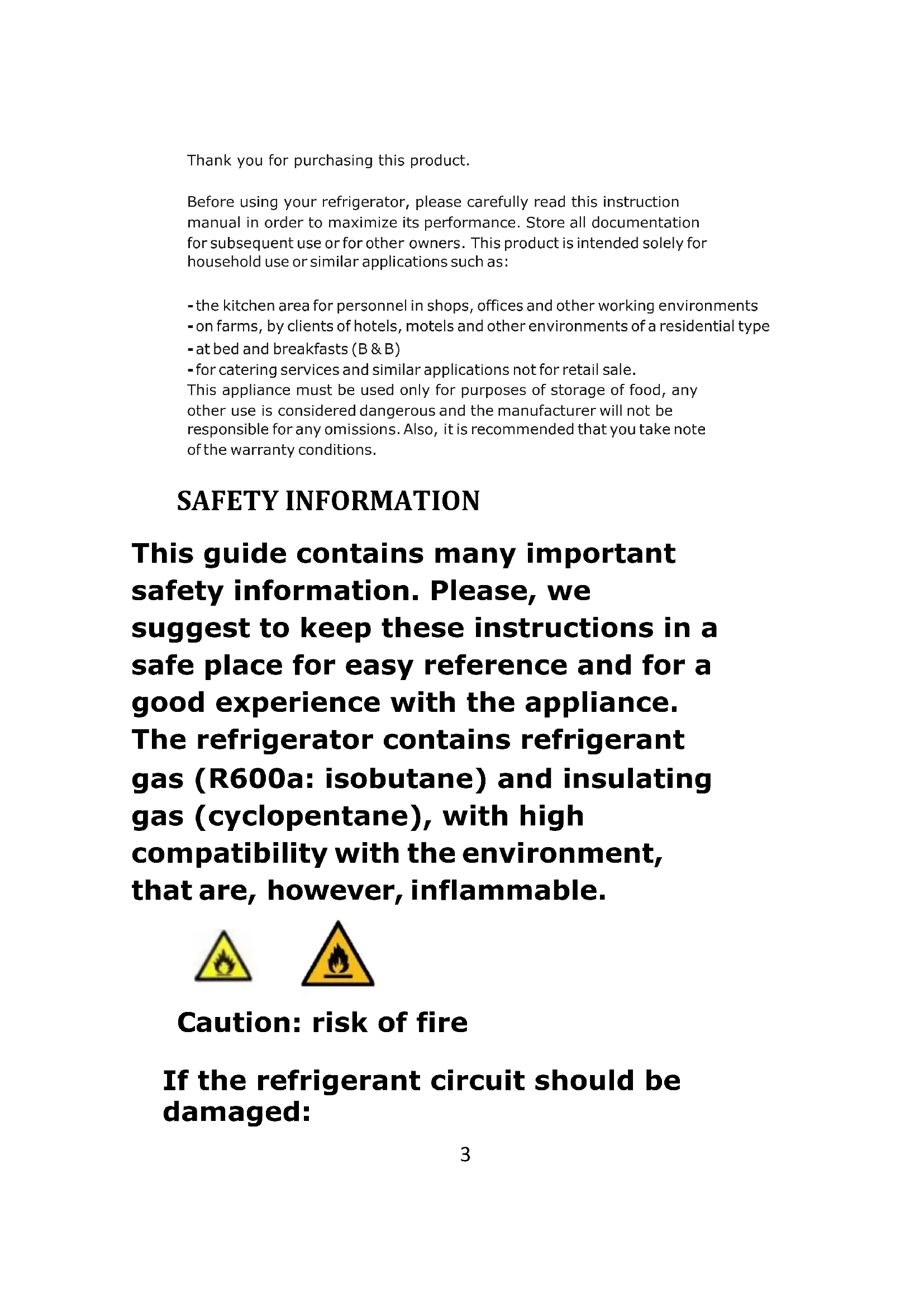 - TROUBLESHOOTING Thank you for purchasing this product. Before using your refrigerator, please carefully read this instruction manual in order to maximize its performance. Store all documentation for subsequent use or for other owners. This product is intended solely for household use or similar applications such as: - the kitchen area for personnel in shops, offices and other working environments - on farms, by clients of hotels, motels and other environments of a residential type - at bed and breakfasts (B & B) - for catering services and similar applications not for retail sale. This appliance must be used only for purposes of storage of food, any other use is considered dangerous and the manufacturer will not be responsible for any omissions. Also, it is recommended that you take note of the warranty conditions. SAFETY INFORMATION This guide contains many important safety information. Please, we suggest to keep these instructions in a safe place for easy reference and for a good experience with the appliance. The refrigerator contains refrigerant gas (R600a: isobutane) and insulating gas (cyclopentane), with high compatibility with the environment, that are, however, inflammable. p. 203