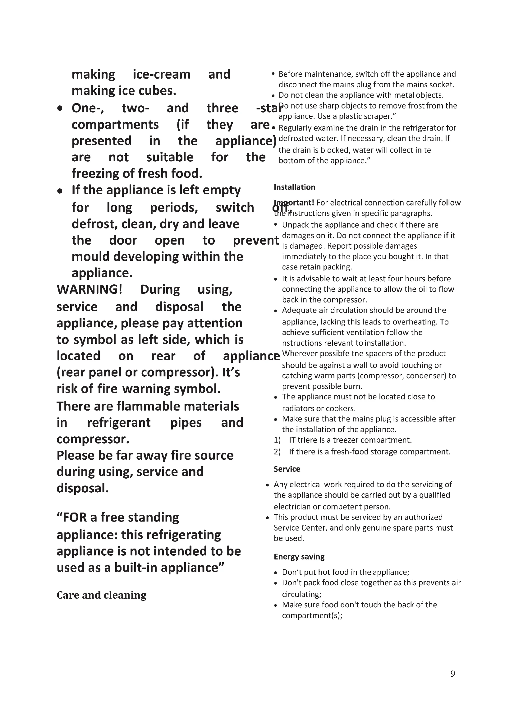 Regularly examine the drain in the refrigerator for defrosted water. If necessary, clean the drain. If the drain is blocked, water will collect in te bottom of the appliance.” /ŶƐƚĂůůĂƚŝŽŶ /ŵƉŽƌƚĂŶƚFor electrical connection carefully follow the instructions given in specific paragraphs.