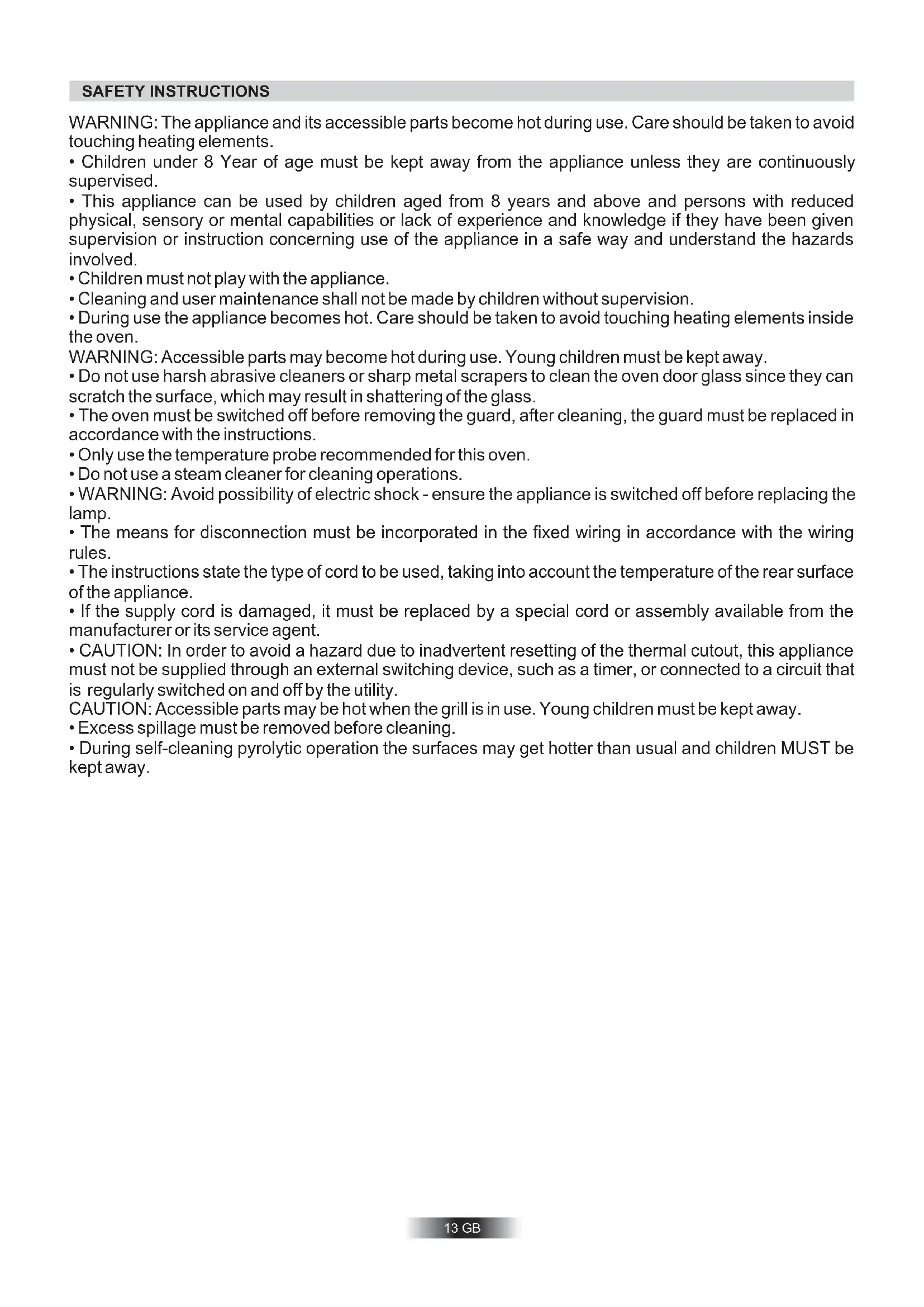 - During self-cleaning pyrolytic operation the surfaces may get hotter than usual and children MUST be kept away. SAFETY INSTRUCTIONS 13 GBGENERAL WARNINGS Thank you for choosing one of our products. To get the most out of your oven we recommend that you: