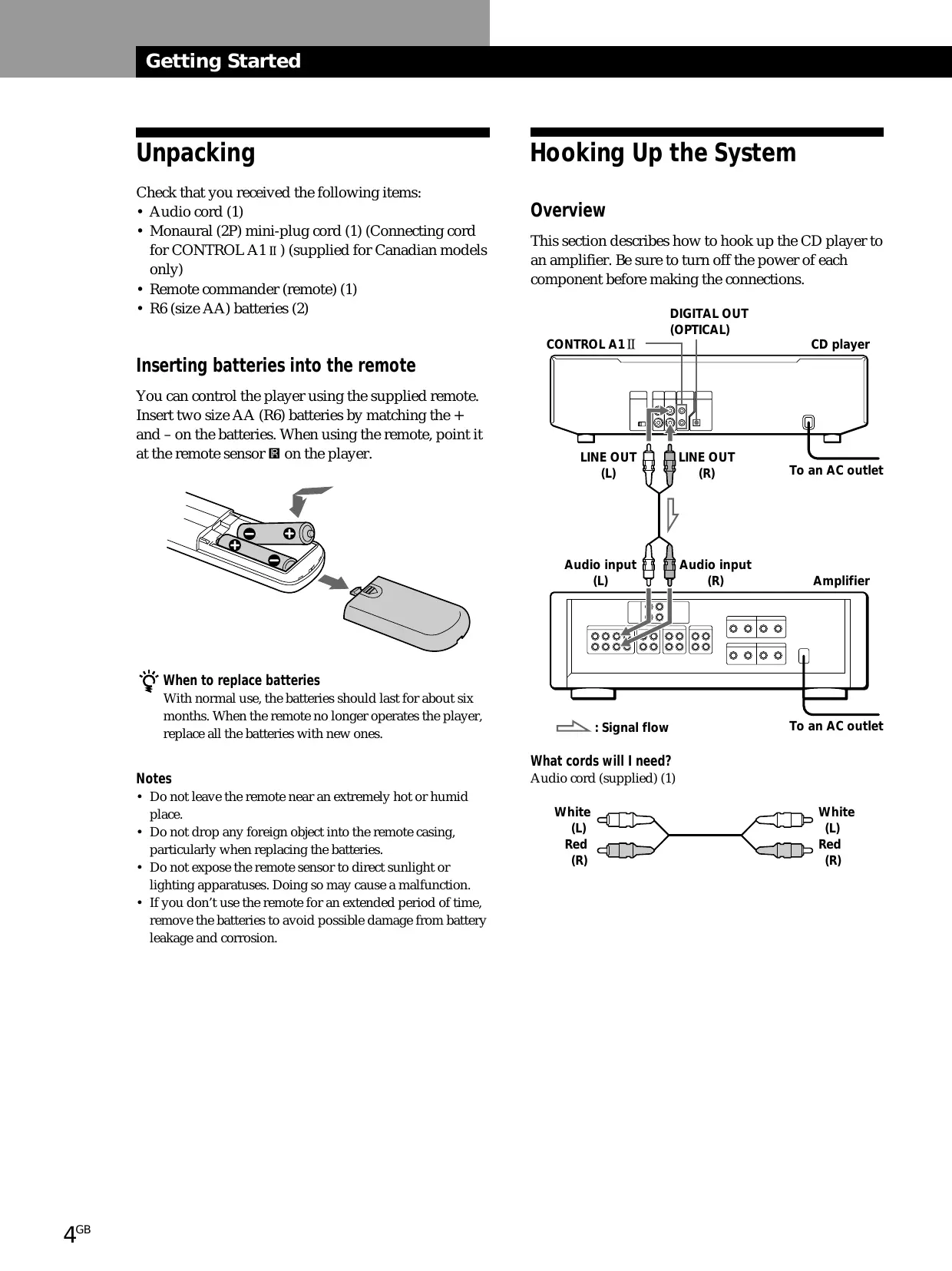 Check that you received the following items: • Audio cord (1) • Monaural (2P) mini-plug cord (1) (Connecting cord for CONTROL A1 ) (supplied for Canadian models only) • Remote commander (remote) (1) • R6 (size AA) batteries (2)