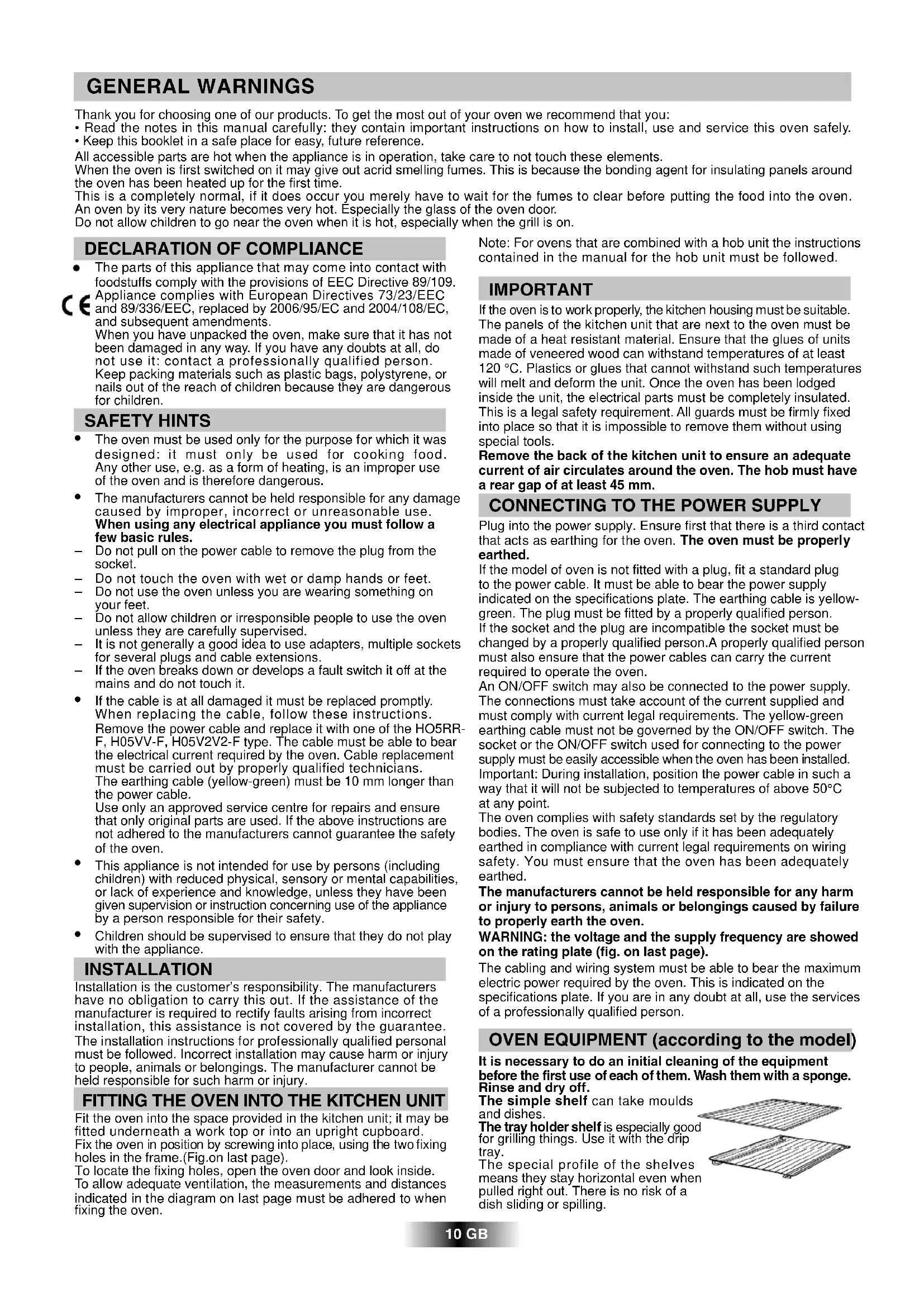 - Keep this booklet in a safe place for easy, future reference. All accessible parts are hot when the appliance is in operation, take care to not touch these elements. When the oven is first switched on it may give out acrid smelling fumes. This is because the bonding agent for insulating panels around the oven has been heated up for the first time. This is a completely normal, if it does occur you merely have to wait for the fumes to clear before putting the food into the oven. An oven by its very nature becomes very hot. Especially the glass of the oven door. Do not allow children to go near the oven when it is hot, especially when the grill is on. GENERAL WARNINGS 10 GB Note: For ovens that are combined with a hob unit the instructions contained in the manual for the hob unit must be followed. IMPORTANT If the oven is to work properly, the kitchen housing must be suitable. The panels of the kitchen unit that are next to the oven must be made of a heat resistant material. Ensure that the glues of units made of veneered wood can withstand temperatures of at least 120 °C. Plastics or glues that cannot withstand such temperatures will melt and deform the unit. Once the oven has been lodged inside the unit, the electrical parts must be completely insulated. This is a legal safety requirement. All guards must be firmly fixed into place so that it is impossible to remove them without using special tools. Remove the back of the kitchen unit to ensure an adequate current of air circulates around the oven. The hob must have a rear gap of at least 45 mm.