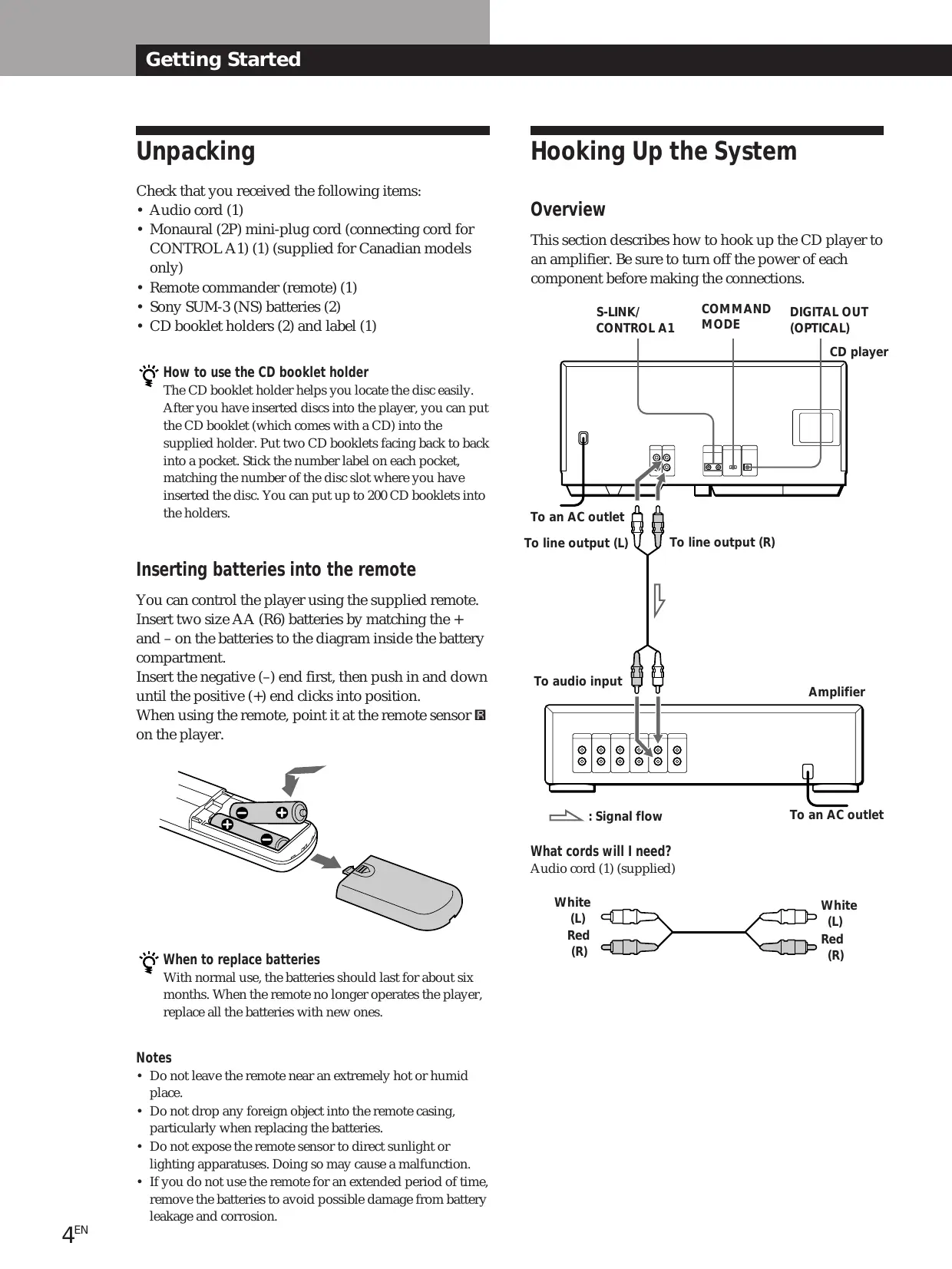 Check that you received the following items: • Audio cord (1) • Monaural (2P) mini-plug cord (connecting cord for CONTROL A1) (1) (supplied for Canadian models only) • Remote commander (remote) (1) • Sony SUM-3 (NS) batteries (2) • CD booklet holders (2) and label (1)