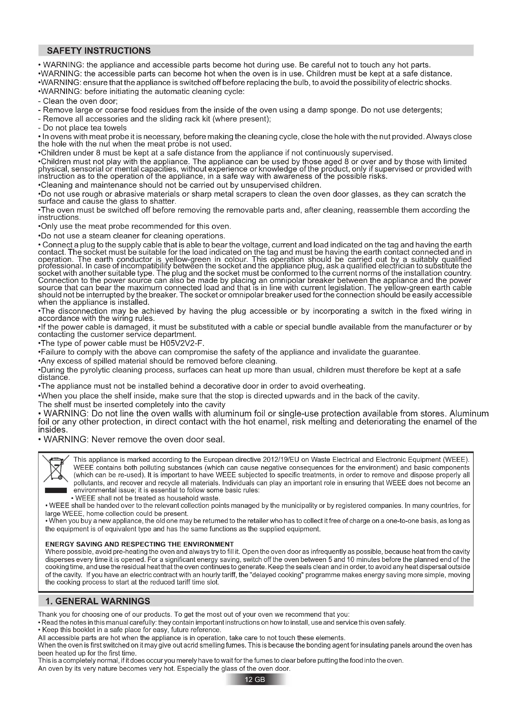 - Keep this booklet in a safe place for easy, future reference. All accessible parts are hot when the appliance is in operation, take care to not touch these elements. When the oven is first switched on it may give out acrid smelling fumes. This is because the bonding agent for insulating panels around the oven has been heated up for the first time. This is a completely normal, if it does occur you merely have to wait for the fumes to clear before putting the food into the oven. An oven by its very nature becomes very hot. Especially the glass of the oven door. This appliance is marked according to the European directive 2012/19/EU on Waste Electrical and Electronic Equipment (WEEE). WEEE contains both polluting substances (which can cause negative consequences for the environment) and basic components (which can be re-used). It is important to have WEEE subjected to specific treatments, in order to remove and dispose properly all pollutants, and recover and recycle all materials. Individuals can play an important role in ensuring that WEEE does not become an environmental issue; it is essential to follow some basic rules: