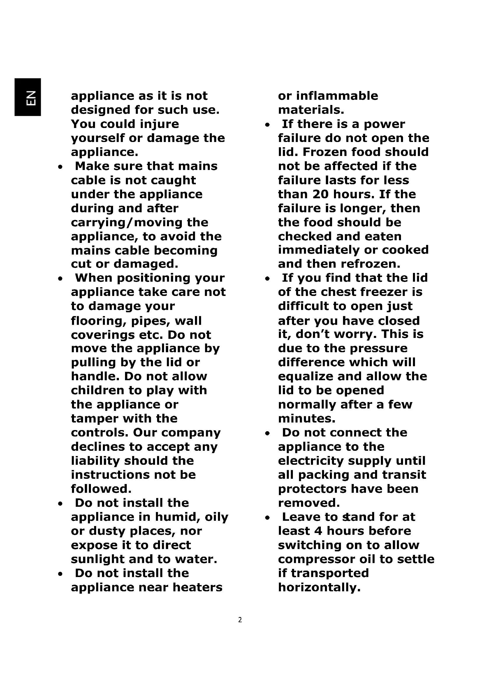 - This freezer must only be used for its intended purpose (i.e. storing and freezing of edible foodstuff).