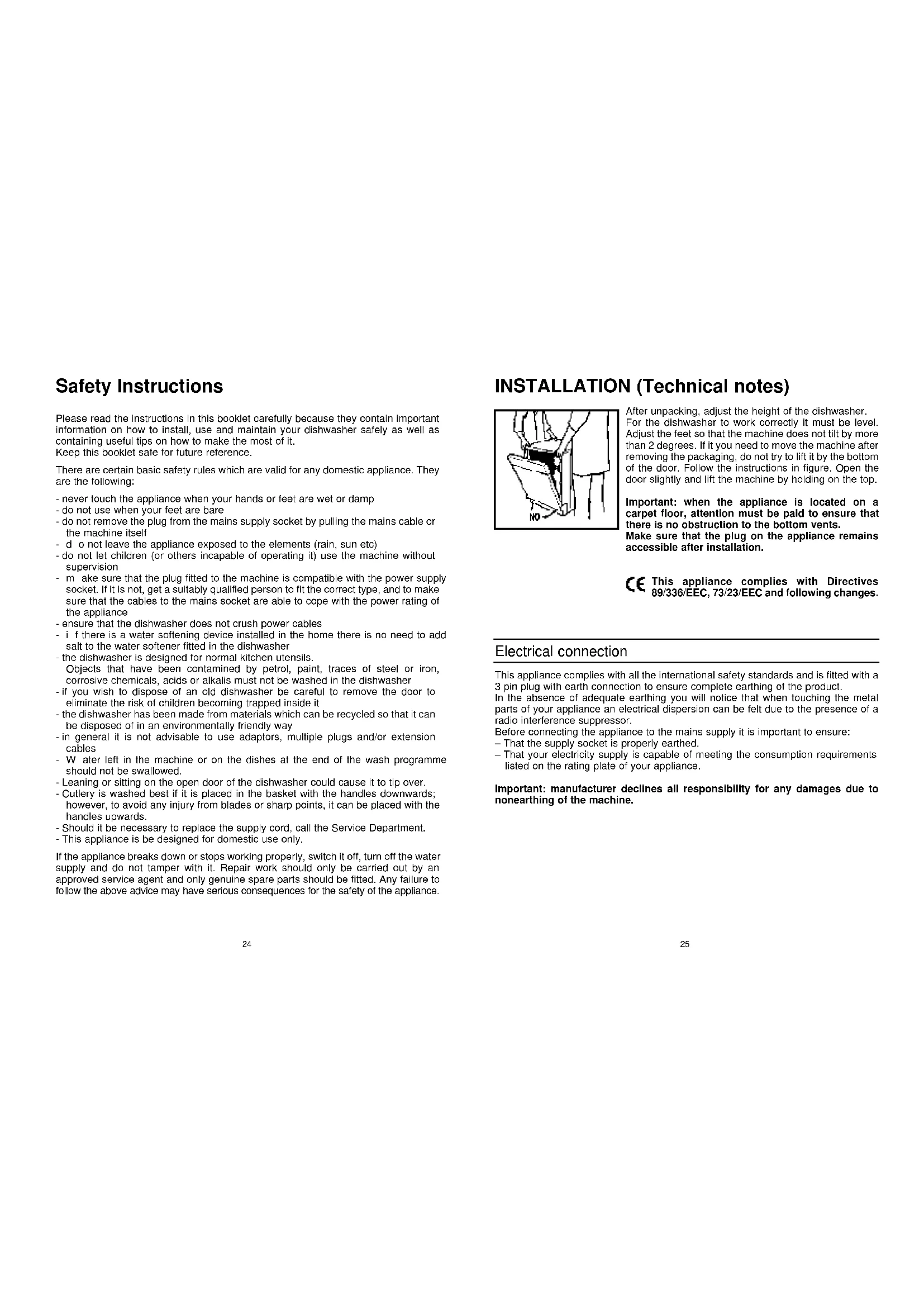 INSTALLATION (Technical notes) After unpacking, adjust the height of the dishwasher. For the dishwasher to work correctly it must be level. Adjust the feet so that the machine does not tilt by more than 2 degrees. If it you need to move the machine after removing the packaging, do not try to lift it by the bottom of the door. Follow the instructions in figure. Open the door slightly and lift the machine by holding on the top. Important: when the appliance is located on a carpet floor, attention must be paid to ensure that there is no obstruction to the bottom vents. Make sure that the plug on the appliance remains accessible after installation. This appliance complies with Directives 89/336/EEC, 73/23/EEC and following changes. Electrical connection This appliance complies with all the international safety standards and is fitted with a 3 pin plug with earth connection to ensure complete earthing of the product. In the absence of adequate earthing you will notice that when touching the metal parts of your appliance an electrical dispersion can be felt due to the presence of a radio interference suppressor. Before connecting the appliance to the mains supply it is important to ensure: – That the supply socket is properly earthed. – That your electricity supply is capable of meeting the consumption requirements listed on the rating plate of your appliance. Important: manufacturer declines all responsibility for any damages due to nonearthing of the machine.