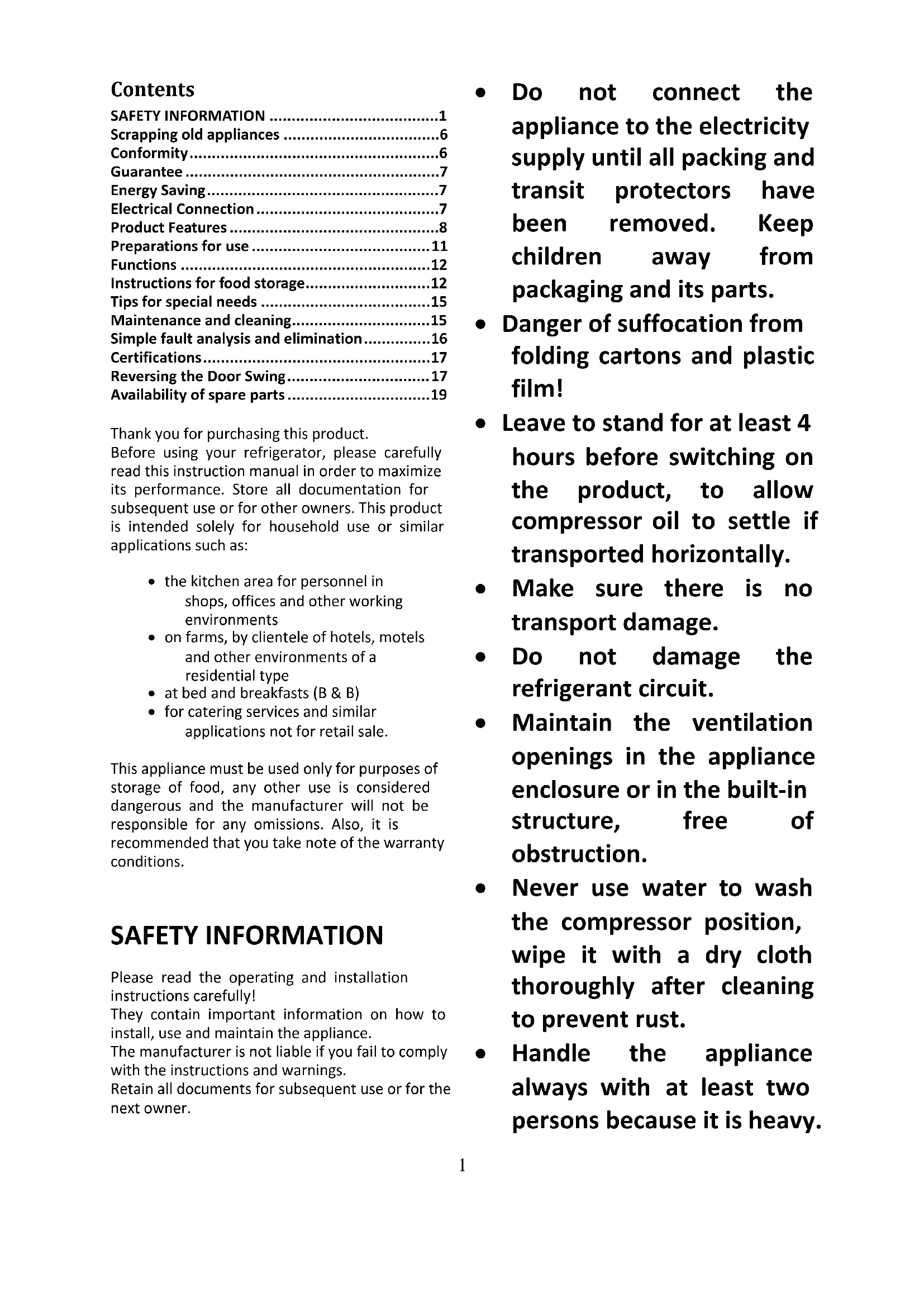 - the kitchen area for personnel in shops, offices and other working environments • on farms, by clientele of hotels, motels and other environments of a residential type • at bed and breakfasts (B & B) • for catering services and similar applications not for retail sale. This appliance must be used only for purposes of storage of food, any other use is considered dangerous and the manufacturer will not be responsible for any omissions. Also, it is recommended that you take note of the warranty conditions. SAFETY INFORMATION Please read the operating and installation instructions carefully! They contain important information on how to install, use and maintain the appliance. The manufacturer is not liable if you fail to comply with the instructions and warnings. Retain all documents for subsequent use or for the next owner.