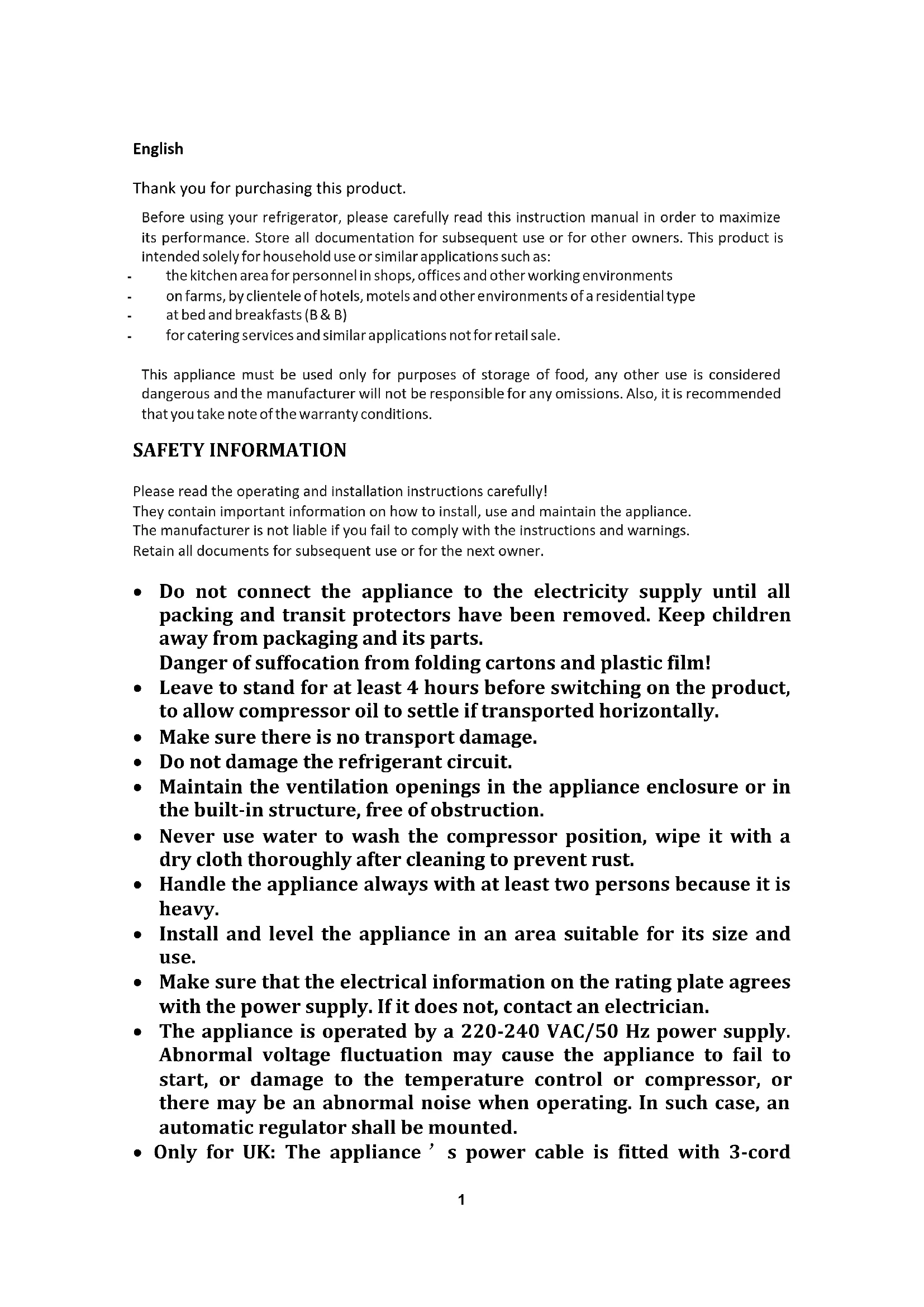 LANGUAGES English 1 Čeština 15 Español 29 Français 44 Italiano 59 Nederlands 73 Polskie 88 Português 103 Slovák 1181 English Thank you for purchasing this product. Before using your refrigerator, please carefully read this instruction manual in order to maximize its performance. Store all documentation for subsequent use or for other owners. This product is intended solely for household use or similar applications such as: - the kitchen area for personnel in shops, offices and other working environments - on farms, by clientele of hotels, motels and other environments of a residential type - at bed and breakfasts (B & B) - for catering services and similar applications not for retail sale. This appliance must be used only for purposes of storage of food, any other use is considered dangerous and the manufacturer will not be responsible for any omissions. Also, it is recommended that you take note of the warranty conditions. SAFETY INFORMATION Please read the operating and installation instructions carefully! They contain important information on how to install, use and maintain the appliance. The manufacturer is not liable if you fail to comply with the instructions and warnings. Retain all documents for subsequent use or for the next owner.