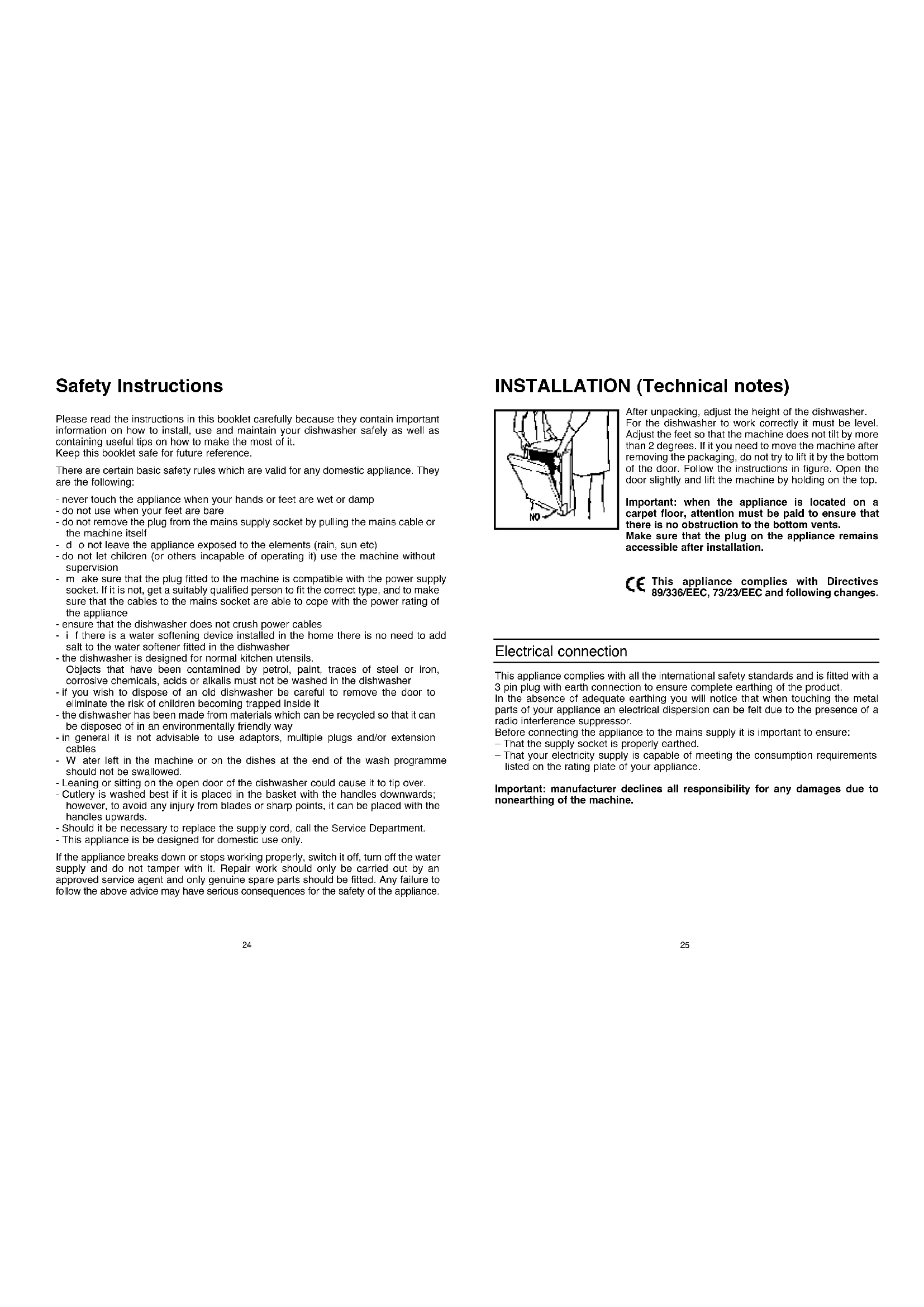 INSTALLATION (Technical notes) After unpacking, adjust the height of the dishwasher. For the dishwasher to work correctly it must be level. Adjust the feet so that the machine does not tilt by more than 2 degrees. If it you need to move the machine after removing the packaging, do not try to lift it by the bottom of the door. Follow the instructions in figure. Open the door slightly and lift the machine by holding on the top. Important: when the appliance is located on a carpet floor, attention must be paid to ensure that there is no obstruction to the bottom vents. Make sure that the plug on the appliance remains accessible after installation. This appliance complies with Directives 89/336/EEC, 73/23/EEC and following changes. Electrical connection This appliance complies with all the international safety standards and is fitted with a 3 pin plug with earth connection to ensure complete earthing of the product. In the absence of adequate earthing you will notice that when touching the metal parts of your appliance an electrical dispersion can be felt due to the presence of a radio interference suppressor. Before connecting the appliance to the mains supply it is important to ensure: – That the supply socket is properly earthed. – That your electricity supply is capable of meeting the consumption requirements listed on the rating plate of your appliance. Important: manufacturer declines all responsibility for any damages due to nonearthing of the machine.