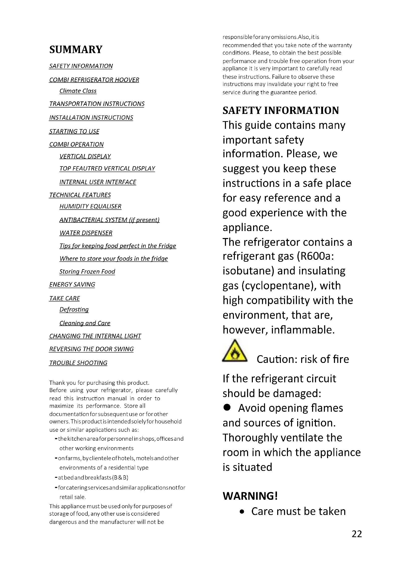 termostati, sensori di temperatura, schede a circuiti stampati e sorgenti luminose sono disponibili per un periodo minimo di sette anni dall’immissione sul mercato dell’ultima unità del modello; maniglie e cerniere delle porte, vassoi e cesti sono disponibili per un periodo minimo di sette anni e guarnizioni delle porte per un periodo minimo di dieci anni dall’immissione sul mercato dell’ultima unità del modello; Per ulteriori informazioni sul prodotto, consultare https://eprel.ec.europa.eu/ o eseguire la scansione del QR sull'etichetta energetica fornita con l'apparecchio22 English SUMMARY SAFETY INFORMATION COMBI REFRIGERATOR HOOVER Climate Class TRANSPORTATION INSTRUCTIONS INSTALLATION INSTRUCTIONS STARTING TO USE COMBI OPERATION VERTICAL DISPLAY TOP FEAUTRED VERTICAL DISPLAY INTERNAL USER INTERFACE TECHNICAL FEATURES HUMIDITY EQUALISER ANTIBACTERIAL SYSTEM (if present) WATER DISPENSER Tips for keeping food perfect in the Fridge Where to store your foods in the fridge Storing Frozen Food ENERGY SAVING TAKE CARE Defrosting Cleaning and Care CHANGING THE INTERNAL LIGHT REVERSING THE DOOR SWING TROUBLE SHOOTING Thank you for purchasing this product. Before using your refrigerator, please carefully read this instruction manual in order to maximize its performance. Store all documentation for subsequent use or for other owners. This product is intended solely for household use or similar applications such as: - the kitchen area for personnel in shops, offices and other working environments - on farms, by clientele of hotels, motels and other environments of a residential type - at bed and breakfasts (B & B) - for catering services and similar applications not for retail sale. This appliance must be used only for purposes of storage of food, any other use is considered dangerous and the manufacturer will not be responsible for any omissions. Also, it is recommended that you take note of the warranty conditions. Please, to obtain the best possible performance and trouble free operation from your appliance it is very important to carefully read these instructions. Failure to observe these instructions may invalidate your right to free service during the guarantee period. SAFETY INFORMATION This guide contains many important safety information. Please, we suggest you keep these instructions in a safe place for easy reference and a good experience with the appliance. The refrigerator contains a refrigerant gas (R600a: isobutane) and insulating gas (cyclopentane), with high compatibility with the environment, that are, however, inflammable. Caution: risk of fire If the refrigerant circuit should be damaged: Avoid opening flames and sources of ignition. Thoroughly ventilate the room in which the appliance is situated Percentage running WARNING! Care must be taken23 while cleaning/carrying the appliance to avoid touching the condenser metal wires at the back of the appliance, as you might injure your fingers and hands or damage your product. This appliance is not designed for stacking with any other appliance. Do not attempt to sit or stand on top of your appliance as it is not designed for such use. You could injure yourself or damage the appliance. Make sure that mains cable is not caught under the appliance during and after carrying/moving the appliance, to avoid the mains cable becoming cut or damaged. When positioning your appliance take care not to damage your flooring, pipes, wall coverings etc. Do not move the appliance by pulling by the lid or handle. Do not allow children to play with the appliance or tamper with the controls. Our company declines to accept any liability should the instructions not be followed. Do not install the appliance in humid, oily or dusty places, nor expose it to direct sunlight and to water. Do not install the appliance near heaters or inflammable materials. If there is a power failure do not open the lid. Frozen food should not be affected if the failure lasts for less than 20 hours. If the failure is longer, then the food24 should be checked and eaten immediately or cooked and then refrozen. If you find that the lid of the chest freezer is difficult to open just after you have closed it, don’t worry. This is due to the pressure difference which will equalize and allow the lid to be opened normally after a few minutes. Do not connect the appliance to the electricity supply until all packing and transit protectors have been removed. Leave to stand for at least 4 hours before switching on to allow compressor oil to settle if transported horizontally. This freezer must only be used for its intended purpose (i.e. storing and freezing of edible foodstuff). Do not store medicine or research materials in the Wine Coolers. When the material that requires a strict control of storage temperatures is to be stored, it is possible that it will deteriorate or an uncontrolled reaction may occur that can cause risks. Before performing any operation, unplug the power cord from the power socket. On delivery, check to make sure that the product is not damaged and that all the parts and accessories are in perfect condition. If in the refrigeration system a leak is noted, do not touch the wall outlet and do not use open flames. Open the window and let air25 into the room. Then call a service center to ask for repair. Do not use extension cords or adapters. Do not excessively pull or fold the power cord or touch the plug with wet hands. Do not damage the plug and/or the power cord; this could cause electrical shocks or fires. If the supply cord is damaged, it must be replaced by the manufacturer, its service agent or similarly qualified person in order to avoid a hazard. Do not place or store inflammable and highly volatile materials such as ether, petrol, LPG, propane gas, aerosol spray cans, adhesives, pure alcohol, etc. These materials may cause an explosion. Do not use or store inflammable sprays, such as spray paint, near the Wine Coolers. It could cause an explosio