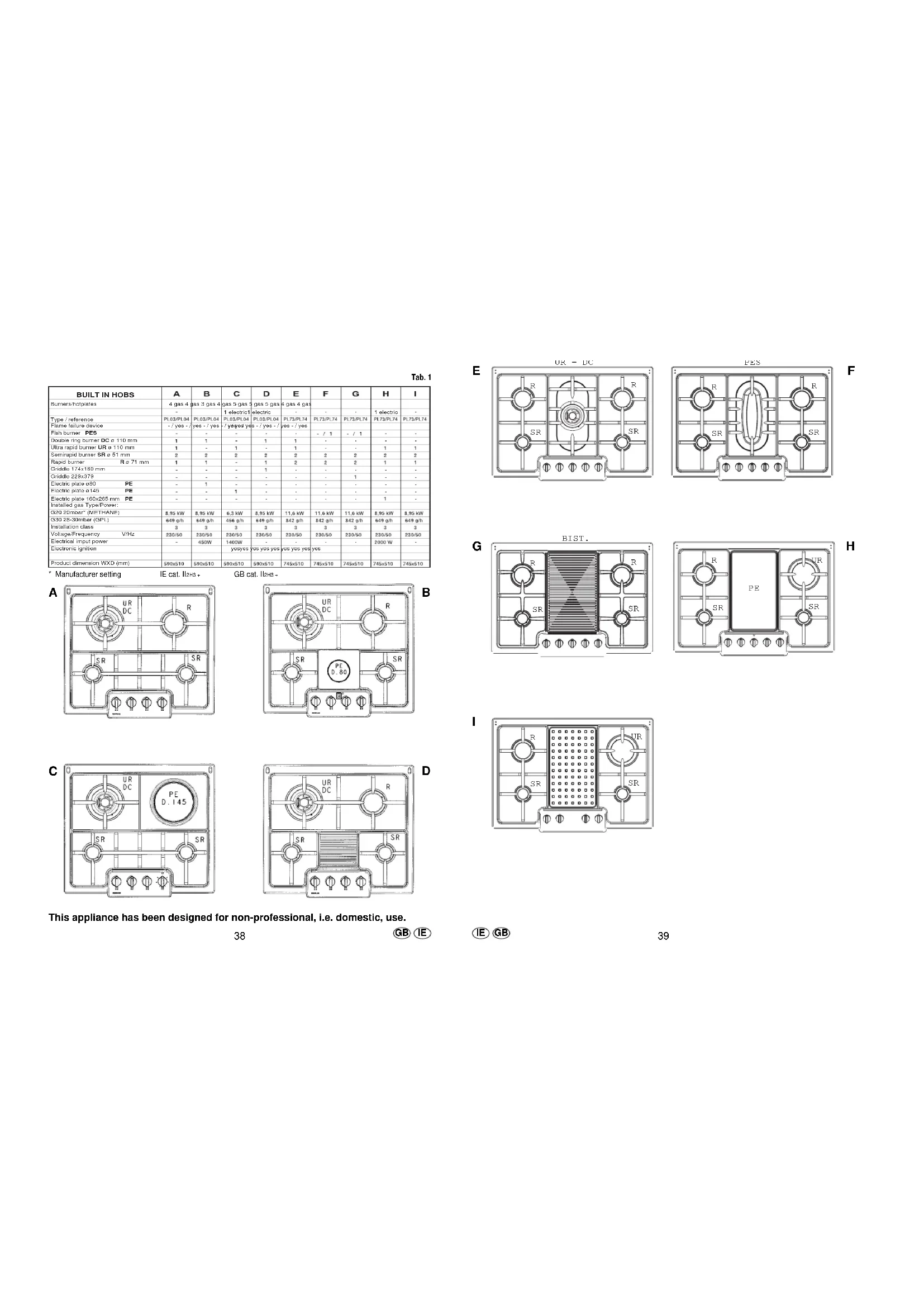 tion and do not attempt to re-ignite if for at least 1 minute. To protect the glass lid from damage and in the interests of safety, the burners/plates must be turned off and the burner/pan support/plate area must be cool before closing the lid down. GB IE GBIEHob type Burner type Ø pan / pot (cm)A;B;C;D;E;F;G;H;I. R/H front burner 12÷18A;B;C;D;E;F;G;H;I. L/H front burner 12÷18A;B;C;D;E;F;G; R/H rear burner 18÷24H;I. R/H rear burner 24÷26A;B;C;D; L/H rear burner 24÷26E;F;G;H;I. L/H rear burner 18÷24E Central burner 24÷28F Central burner24÷28 ø pan. Max 18,5x33; min 15x24H Central radiant plate CXdo not overhang the radiant plate