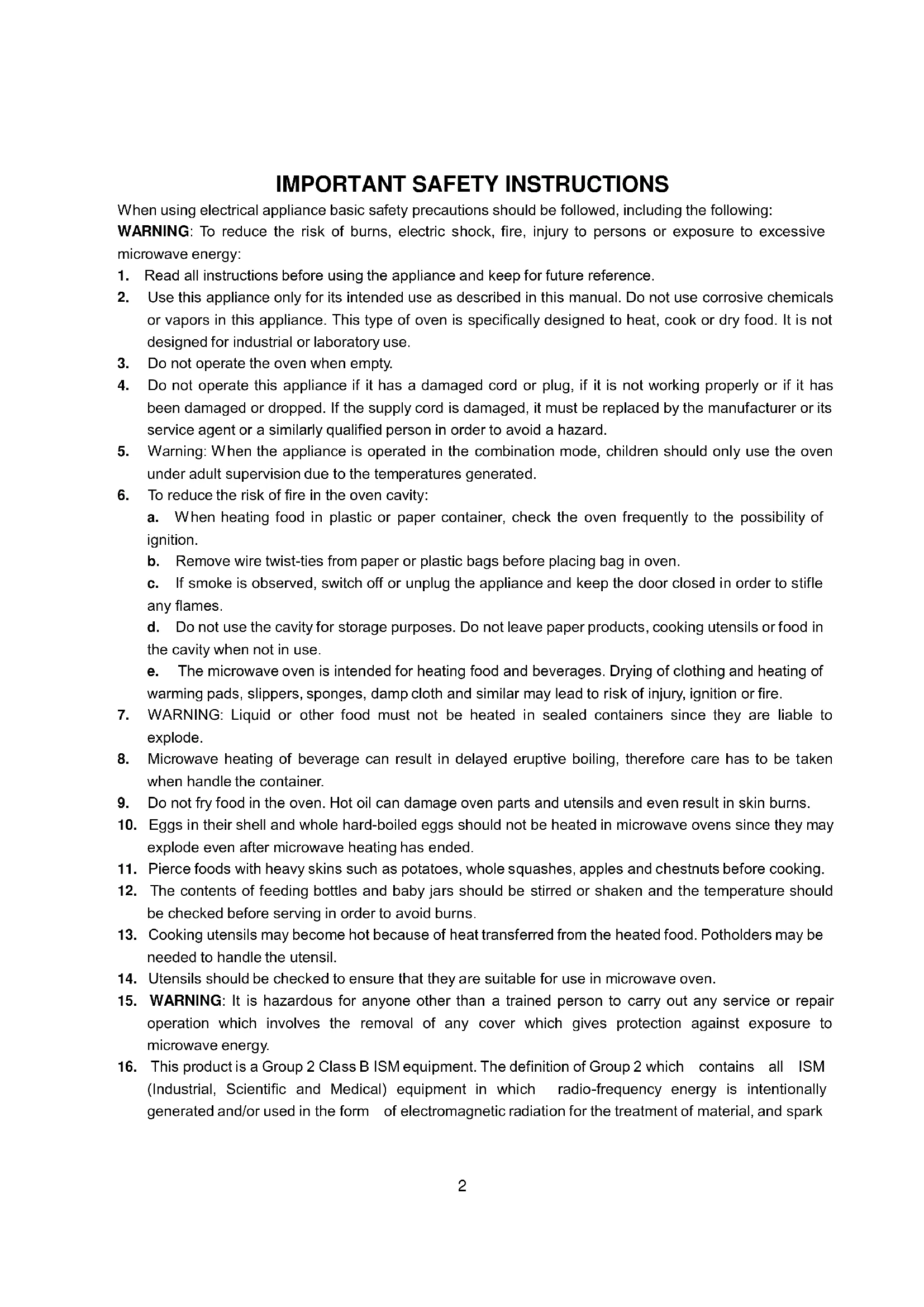 a. When heating food in plastic or paper container, check the oven frequently to the possibility of ignition. b. Remove wire twist-ties from paper or plastic bags before placing bag in oven. c. If smoke is observed, switch off or unplug the appliance and keep the door closed in order to stifle any flames. d. Do not use the cavity for storage purposes. Do not leave paper products, cooking utensils or food in the cavity when not in use. e. The microwave oven is intended for heating food and beverages. Drying of clothing and heating of warming pads, slippers, sponges, damp cloth and similar may lead to risk of injury, ignition or fire.