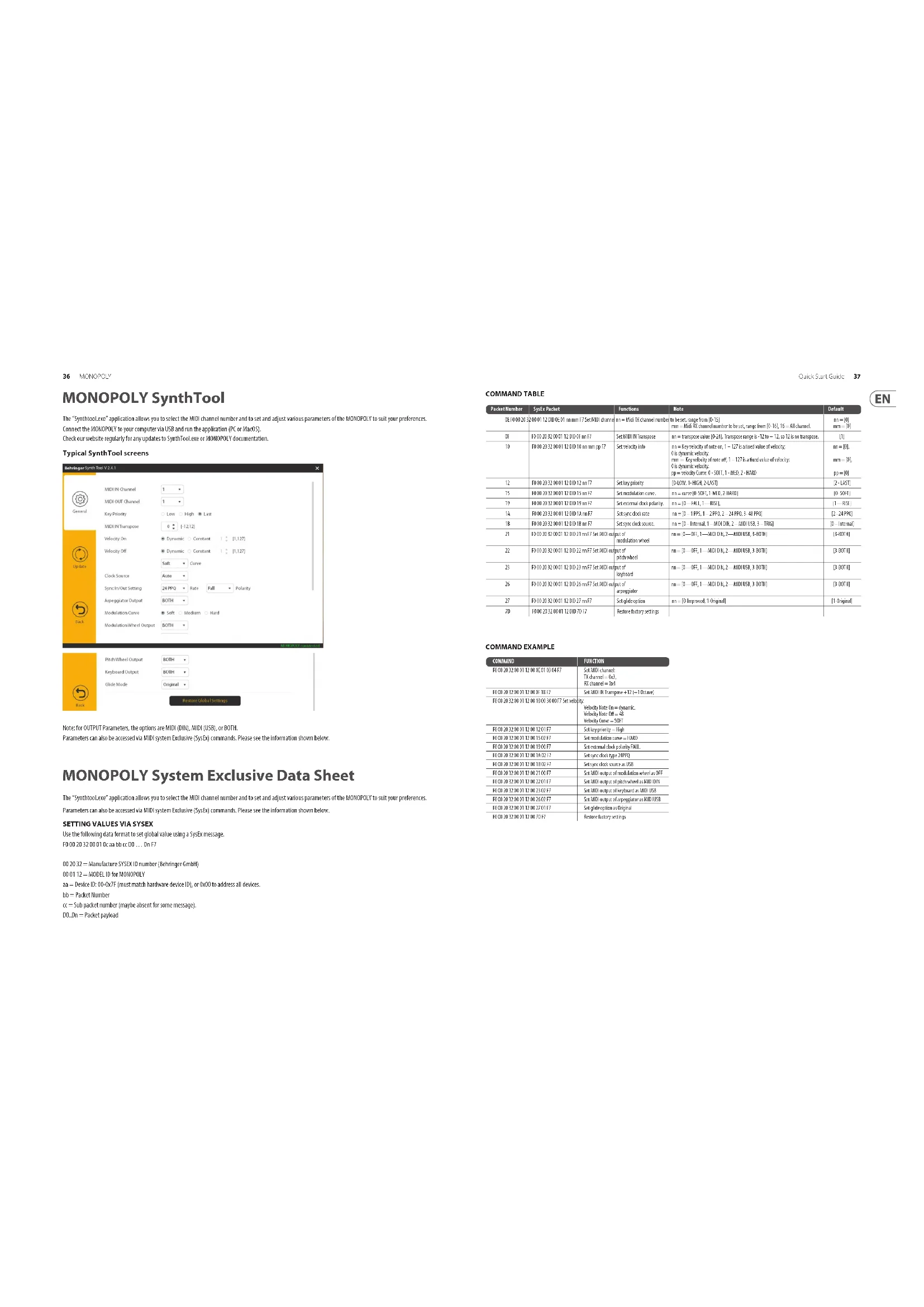Use the following data format to set global value using a SysEx message. F0 00 20 32 00 01 0c aa bb cc D0 … Dn F7 00 20 32 = Manufacture SYSEX ID number (Behringer GmbH) 00 01 12 = MODEL ID for MONOPOLY aa = Device ID: 00-0x7F (must match hardware device ID), or 0x00 to address all devices. bb = Packet Number cc = Sub packet number (maybe absent for some message). D0..Dn = Packet payload Packet Number SysEx Packet Functions Note Default 0E F0 00 20 32 00 01 12 DID 0E 01 nn mm F7 Set MIDI channel nn = Midi TX channel number to be set, range from [0-15] mm = Midi RX channel number to be set, range from [0-16], 16 = All channel. nn = [0] mm = [0] 0F F0 00 20 32 00 01 12 DID 0F nn F7 Set MIDI IN Transpose nn = transpose value [0-24]. Transpose range is -12 to + 12, so 12 is no transpose. [1] 10 F0 00 20 32 00 01 12 DID 10 nn mm pp F7 Set velocity info nn = Key velocity of note on, 1 – 127 is a xed value of velocity; 0 is dynamic velocity. mm = Key velocity of note o, 1 – 127 is a xed value of velocity; 0 is dynamic velocity. pp = velocity Curve: 0 - SOFT, 1 - MED, 2 - HARD nn = [0], mm = [0], pp = [0] 12 F0 00 20 32 00 01 12 DID 12 nn F7 Set key priority [0-LOW, 1- HIGH, 2-LAST] [2 - LAST] 15 F0 00 20 32 00 01 12 DID 15 nn F7 Set modulation curve. nn = curve [0-SOFT, 1-MED, 2-HARD] [0- SOFT] 19 F0 00 20 32 00 01 12 DID 19 nn F7 Set external clock polarity. nn = [0—FALL, 1—RISE], [1—RISE] 1A F0 00 20 32 00 01 12 DID 1A nn F7 Set sync clock rate nn = [0 – 1 PPS, 1 – 2 PPQ, 2 – 24 PPQ, 3- 48 PPQ] [2--24 PPQ] 1B F0 00 20 32 00 01 12 DID 1B nn F7 Set sync clock source. nn = [0 – Internal, 1 – MIDI DIN, 2 – MIDI USB, 3 – TRIG] [0 – Internal] 21 F0 00 20 32 00 01 12 DID 21 nn F7 Set MIDI output of modulation wheel nn = [0—OFF, 1—MIDI DIN, 2—MIDI USB, 3-BOTH] [3-BOTH] 22 F0 00 20 32 00 01 12 DID 22 nn F7 Set MIDI output of pitch wheel nn = [0—OFF, 1—MIDI DIN, 2—MIDI USB, 3-BOTH] [3-BOTH] 23 F0 00 20 32 00 01 12 DID 23 nn F7 Set MIDI output of keyboard nn = [0—OFF, 1—MIDI DIN, 2—MIDI USB, 3-BOTH] [3-BOTH] 26 F0 00 20 32 00 01 12 DID 26 nn F7 Set MIDI output of arpeggiator nn = [0—OFF, 1—MIDI DIN, 2—MIDI USB, 3-BOTH] [3-BOTH] 27 F0 00 20 32 00 01 12 DID 27 nn F7 Set glide option nn = [0-Improved, 1-Original] [1-Original] 7D F0 00 20 32 00 01 12 DID 7D F7 Restore factory settings COMMAND EXAMPLE COMMAND TABLE COMMAND FUNCTION F0 00 20 32 00 01 12 00 0E 01 03 04 F7 Set MIDI channel: TX channel = 0x3, RX channel = 0x4 F0 00 20 32 00 01 12 00 0F 18 F7 Set MIDI IN Transpose +12 (+1 Octave) F0 00 20 32 00 01 12 00 10 00 30 00 F7 Set velocity: Velocity Note On = dynamic. Velocity Note O = 48 Velocity Curve = SOFT F0 00 20 32 00 01 12 00 12 01 F7 Set key priority = High F0 00 20 32 00 01 12 00 15 02 F7 Set modulation curve = HARD F0 00 20 32 00 01 12 00 19 00 F7 Set external clock polarity FALL. F0 00 20 32 00 01 12 00 1A 02 F7 Set sync clock type 24PPQ F0 00 20 32 00 01 12 00 1B 02 F7 Set sync clock source as USB F0 00 20 32 00 01 12 00 21 00 F7 Set MIDI output of modulation wheel as OFF F0 00 20 32 00 01 12 00 22 01 F7 Set MIDI output of pitch wheel as MIDI DIN F0 00 20 32 00 01 12 00 23 02 F7 Set MIDI output of keyboard as MIDI USB F0 00 20 32 00 01 12 00 26 02 F7 Set MIDI output of arpeggiator as MIDI USB F0 00 20 32 00 01 12 00 27 01 F7 Set glide option as Original F0 00 20 32 00 01 12 00 7D F7 Restore factory settings38 MONOPOLY Quick Start Guide 39 MONOPOLY Patch Sheet Patch Number DATE: NOTES: AUTHOR: TITLE: MONOPOLY Default Patch NOTES: The simplied settings shown below will help you get started making sounds, with VCO1 as a triangular waveform. Some control settings are shown with an arrow. These do not need to be on maximum, just as long as they are at least half-way or more, to get you started.40 MONOPOLY Quick Start Guide 41 Specications Synthesizer Architecture Modes Chord memory, unison mono, unison share, poly Type Analog Oscillators 4 (32.7 Hz to 4.186 Hz) LFO MG1 0.1 Hz to 20 Hz MG2 0.1 Hz to 30 Hz VCF low pass lter, 24 dB/oct. slope Envelopes VCA, VCF MIDI channels 16 Connectivity MIDI in / out/ thru 5-pin DIN USB (MIDI) Type B Main output 1 x 1/4" TS, unbalanced Max. output level +6 dBu Impedance 700 Ω Headphones 1 x 1/4" TRS, stereo Max. output level -2 dBu External control inputs Arpeggiator Sync in 1 x 1/4" TRS, Tip=clock, Ring=start/stop signal Portamento 1 x 1/4" TS, unbalanced VCF cuto freq mod 1 x 1/4" TS, unbalanced, -5 V to +5 V VCO freq mod 1 x 1/4" TS, unbalanced, -5 V to +5 V, 1 Oct/V Trigger in 1 x 1/4" TS, unbalanced CV in 1 x 1/4" TS, unbalanced, 1 Oct/V Internal control outputs Trigger out 1 x 1/4" TS, unbalanced CV out 1 x 1/4" TS, unbalanced, 1 Oct/V Switch Trigger polarity: 15V, ground General Controls Knobs Output volume: 0 to 10, adjustable Bend wheel intensity: 0 to 10, adjustable MG 1 wheel intensity: 0 to 10, adjustable Portamento: 0 to 10, adjustable Master tune: 0 to 10, adjustable Detune: 0 to 10, adjustable Switches Output: high/ low/ o Bend wheel: vco 1/ slave vco/ pitch / vcf MG 1 wheel: vco 1/ slave vco/ pitch / vcf Transpose: up / normal/ down Modulation Knobs MG 1 frequency: 0 to 10, adjustable MG 1 waveform: triangular/ reverse saw/ saw/ pulse, selectable MG 2 frequency: 0 to 10, adjustable PWM intensity: 0 to 10, adjustable PW intensity: 0 to 10, adjustable X-mod: 0 to 10, adjustable Freq mod: 0 to 10, adjustable Switches PMW: vcf eg/ mg 1/ mg 2 Freq mod: vcf eg/ mg 1 Mode: sync/ s & x / x-mod Mode: single/ double LED (red) Mg 1 frequency Mg 2 frequency Arpeggiator Switches Full/ 2 octave/ 1 octave Up/ down/ up+down Latch/ on/ o Eects Switch (with LED) Eects: on/ o Key Assign Mode Switches (with LED) Hold Chord memory (mono) Unison (mono) Unison/share (poly) Poly Oscillator Bank Knobs Tune (OSC 2, 3, and 4): adjustable Waveform: triangular/ reverse saw/ pwm/ pw, selectable Octave: 16', 8', 4', 2', selectable Level: 0 to 10, adjustable LED (red) VCO 1, 2, 3, 4 on VCF Section Knobs Cuto frequency: 0 to 10