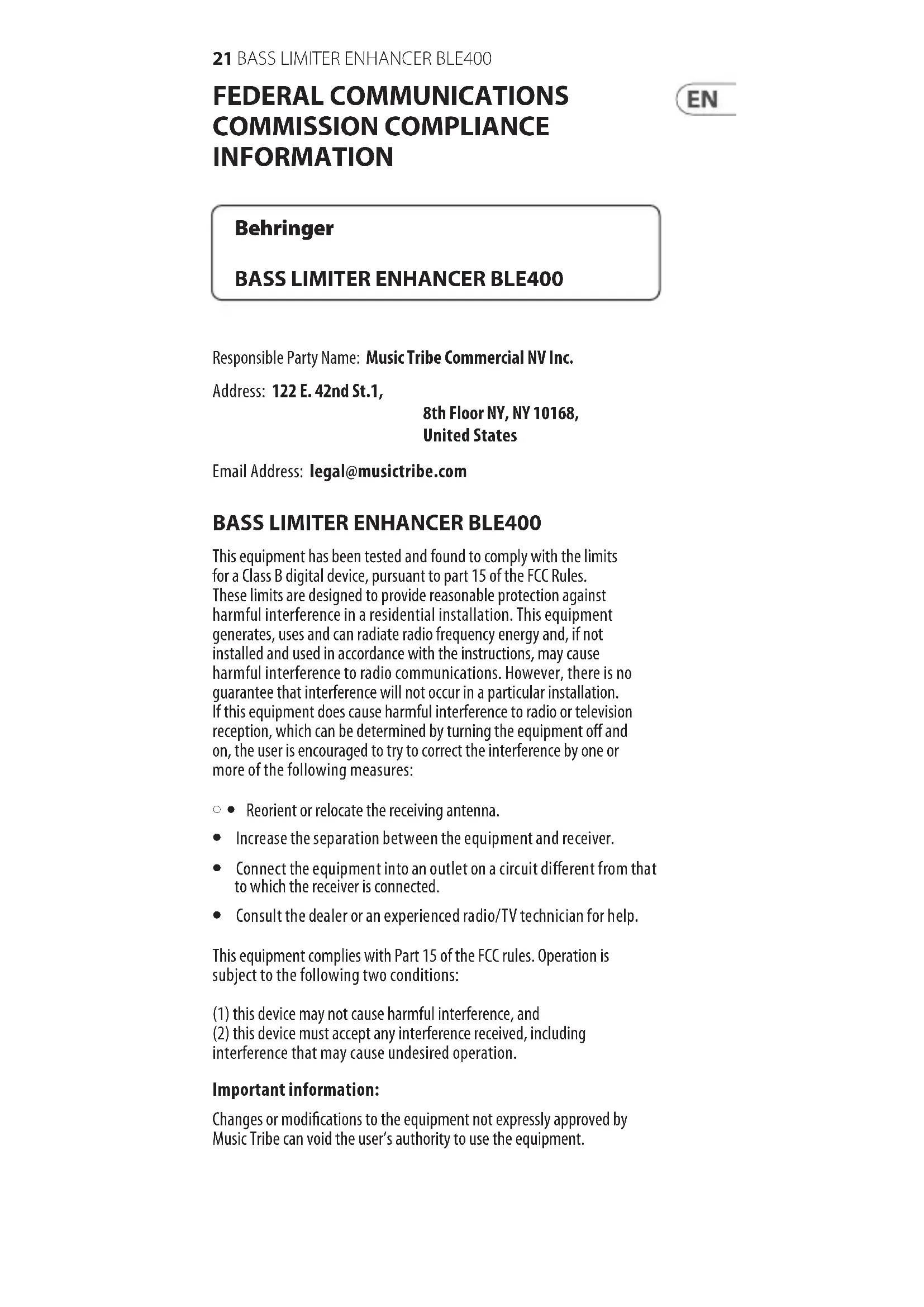 Behringer22BASS LIMITER ENHANCER BLE400 Hereby, Music Tribe declares that this product is in compliance with Directive 2014/30/EU, Directive 2011/65/EU and Amendment 2015/863/ EU, Directive 2012/19/EU, Regulation 519/2012 REACH SVHC and Directive 1907/2006/EC. Full text of EU DoC is available at https://community.musictribe.com/ EU Representative: Music Tribe Brands DK A/S Address: Gammel Strand 44, DK-1202 København K, Denmark UK Representative: Music Tribe Brands UK Ltd. Address: 6 Lloyds Avenue, Unit 4CL London EC3N 3AX, United KingdomBatteries (battery pack or batteries installed) shall not be exposed to excessive heat such as sunshine, re or the like. WARNING