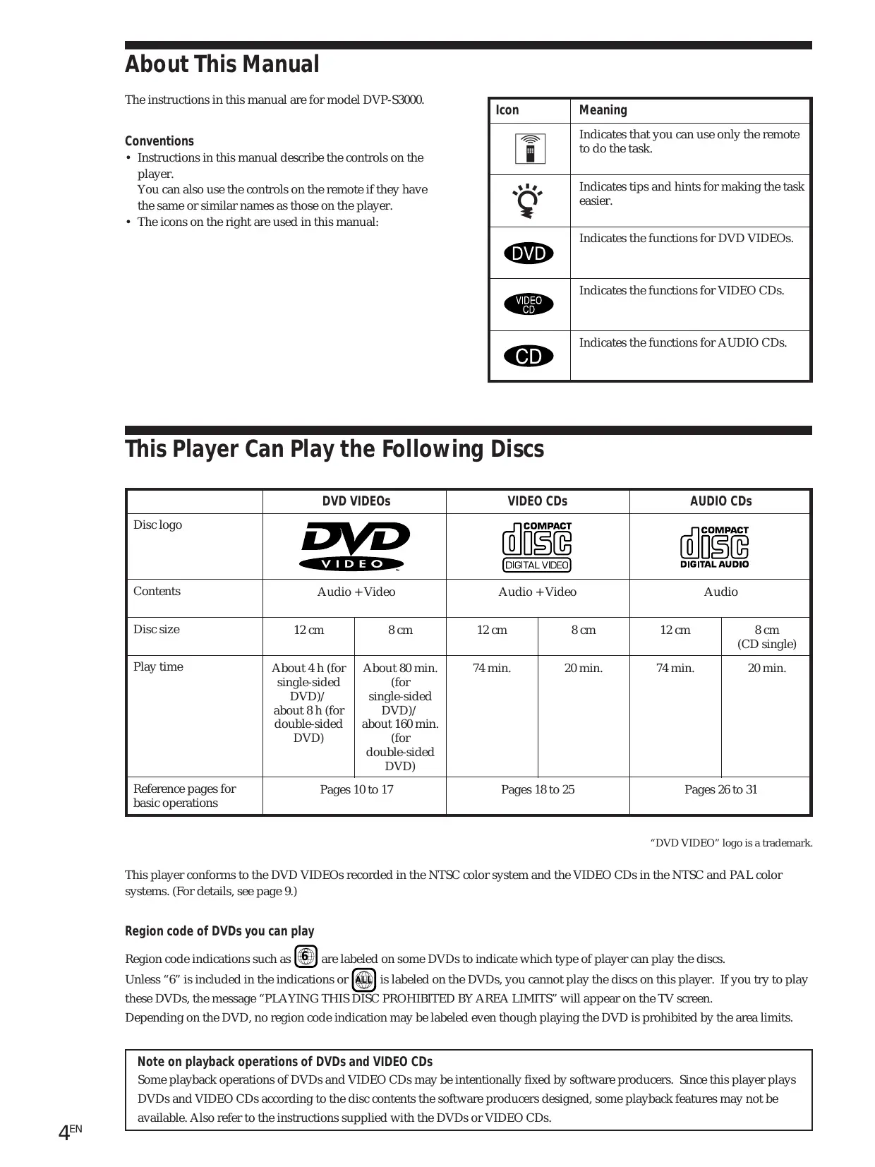 3EN Getting Started About This Manual The instructions in this manual are for model DVP-S3000.