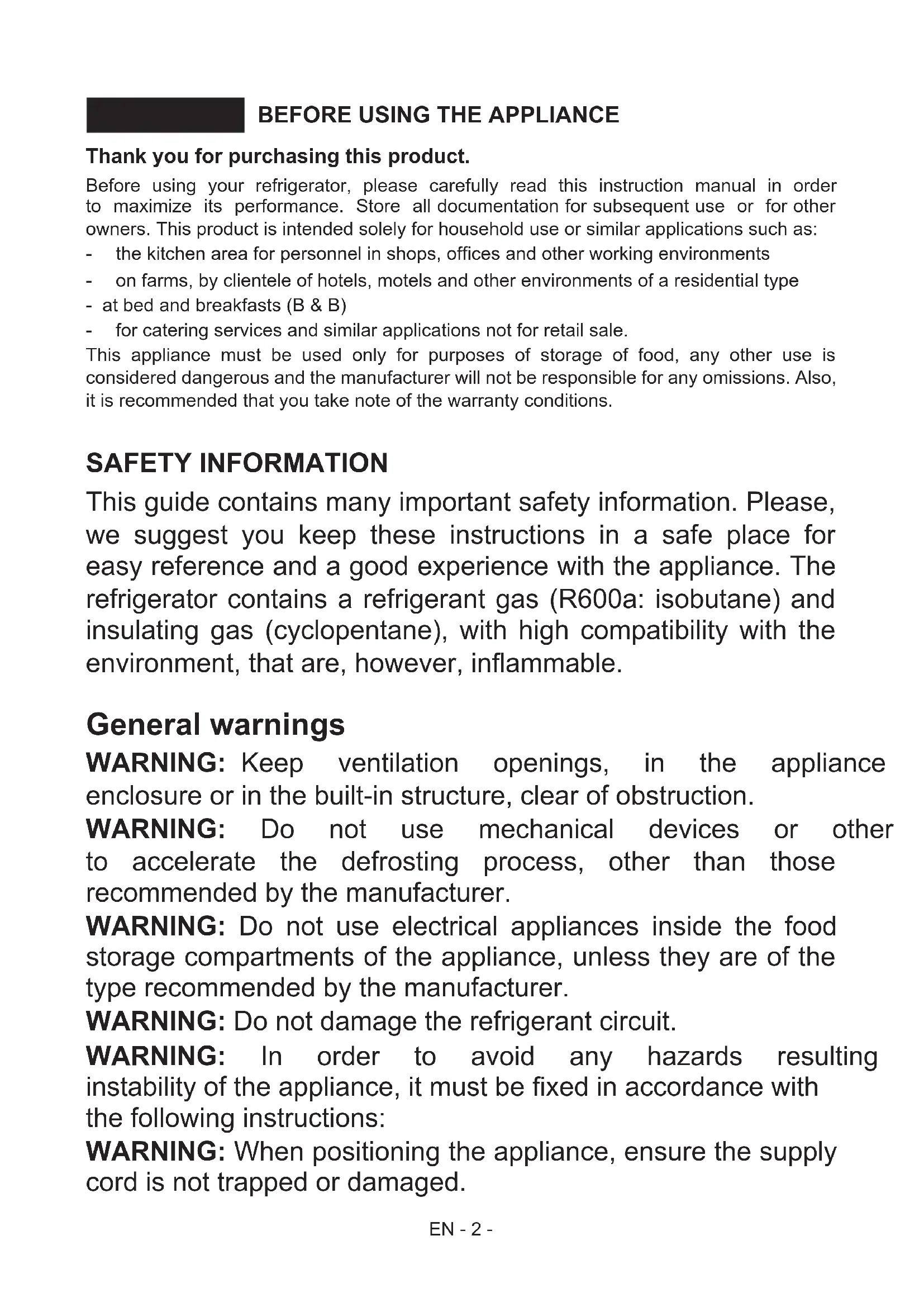 CE Declaration of conformity .................................................................................. 24EN - 2 - Thank you for purchasing this product. Before using your refrigerator, please carefully read this instruction manual in order to maximize its performance. Store all documentation for subsequent use or for other owners. This product is intended solely for household use or similar applications such as: - thekitchenareaforpersonnelinshops,ofcesandotherworkingenvironments - onfarms,byclienteleofhotels,motelsandotherenvironmentsofaresidentialtype - at bed and breakfasts (B & B) - forcateringservicesandsimilarapplicationsnotforretailsale. This appliance must be used only for purposes of storage of food, any other use is considered dangerous and the manufacturer will not be responsible for any omissions. Also, it is recommended that you take note of the warranty conditions. SAFETY INFORMATION This guide contains many important safety information. Please, we suggest you keep these instructions in a safe place for easy reference and a good experience with the appliance. The refrigerator contains a refrigerant gas (R600a: isobutane) and insulating gas (cyclopentane), with high compatibility with the environment,thatare,however,inammable. BEFORE USING THE APPLIANCECHAPTER 1. General warnings