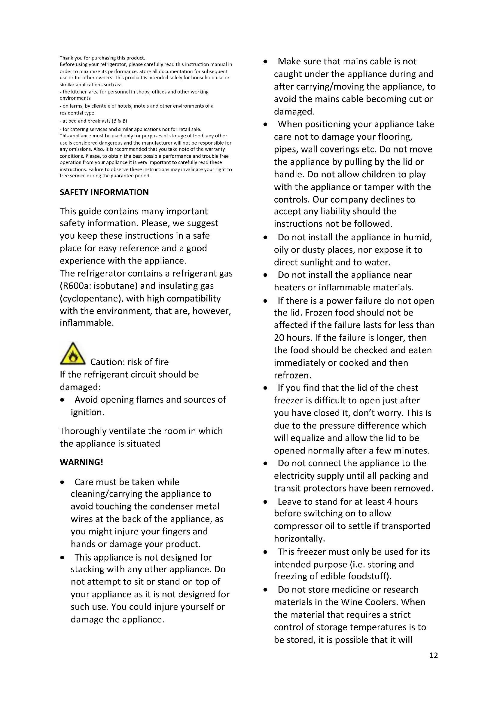- Do not dispose of the appliance on a fire. Take care not to damage, the cooling circuit/pipes of the appliance in transportation and in use. In case of damage do not expose the appliance to fire, potential ignition source and immediately ventilate the room where the appliance is situated.
