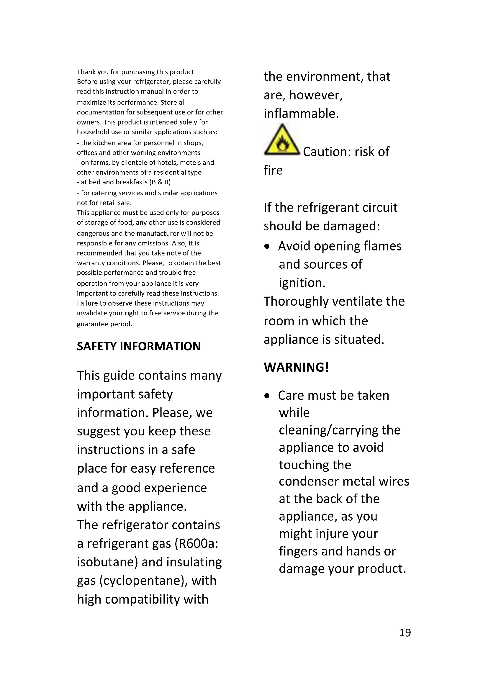 - Rimuovere la polvere accumulata sulla parte posteriore dell'elettrodomestico.19 Thank you for purchasing this product. Before using your refrigerator, please carefully read this instruction manual in order to maximize its performance. Store all documentation for subsequent use or for other owners. This product is intended solely for household use or similar applications such as: - the kitchen area for personnel in shops, offices and other working environments - on farms, by clientele of hotels, motels and other environments of a residential type - at bed and breakfasts (B & B) - for catering services and similar applications not for retail sale. This appliance must be used only for purposes of storage of food, any other use is considered dangerous and the manufacturer will not be responsible for any omissions. Also, it is recommended that you take note of the warranty conditions. Please, to obtain the best possible performance and trouble free operation from your appliance it is very important to carefully read these instructions. Failure to observe these instructions may invalidate your right to free service during the guarantee period. SAFETY INFORMATION This guide contains many important safety information. Please, we suggest you keep these instructions in a safe place for easy reference and a good experience with the appliance. The refrigerator contains a refrigerant gas (R600a: isobutane) and insulating gas (cyclopentane), with high compatibility with the environment, that are, however, inflammable. Caution: risk of fire If the refrigerant circuit should be damaged: