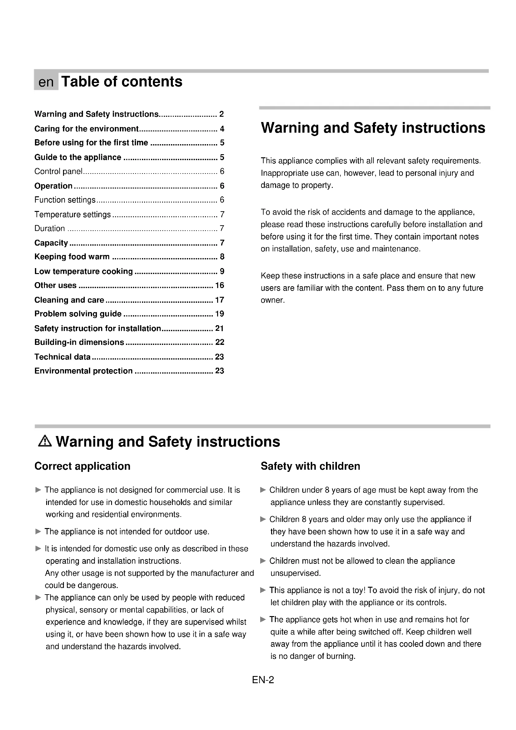 Warning and Safety instructions Correct application ► The appliance is not designed for commercial use. It is intended for use in domestic households and similar working and residential environments. ► The appliance is not intended for outdoor use. ► It is intended for domestic use only as described in these operating and installation instructions. Any other usage is not supported by the manufacturer and could be dangerous. ► The appliance can only be used by people with reduced physical, sensory or mental capabilities, or lack of experience and knowledge, if they are supervised whilst using it, or have been shown how to use it in a safe way and understand the hazards involved. Safety with children ► Children under 8 years of age must be kept away from the appliance unless they are constantly supervised. ► Children 8 years and older may only use the appliance if they have been shown how to use it in a safe way and understand the hazards involved. ► Children must not be allowed to clean the appliance unsupervised. ► This appliance is not a toy! To avoid the risk of injury, do not let children play with the appliance or its controls. ► The appliance gets hot when in use and remains hot for quite a while after being switched off. Keep children well away from the appliance until it has cooled down and there is no danger of burning.EN-3 ► Packaging, e.g. cling film, polystyrene and plastic wrappings, must be kept out of the reach of babies and children. Danger of suffocation. Dispose of or recycle all packaging safely as soon as possible. Technical safety ► Installation, maintenance and repair work may only be carried out by a suitably qualified and competent person in strict accordance with national and local safety regulations. Installation, maintenance and repairs by unqualified persons could be dangerous. ► A damaged appliance can be dangerous. Before installation, check the appliance for visible signs of damage. Do not use a damaged appliance. ► The electrical safety of this appliance can only be guaranteed when correctly earthed. It is most important that this basic safety requirement is observed and regularly tested, and where there is any doubt, the household wiring system should be inspected b y a qualified electrician. ► To avoid the risk of damage to the appliance, make sure that the connection data (frequency and voltage) on the data plate corresponds to the household supply, before connecting the appliance to the mains supply. Consult a qualified electrician if in any doubt. ► Do not connect the appliance to the mains electricity supply by a multi-socket adapter or an extension lead. These do not guarantee the required safety of the appliance (e.g. danger of overheating). ► For safety reasons, this appliance may only be used when it has been built in. This appliance must not be used in a non-stationary location (e.g. on a ship). ► Do not open the casing of the appliance. Tampering with electrical connections or components and mechanical parts is highly dangerous to the user and can cause operational faults. ► While the appliance is under guarantee, repairs should only be undertaken by a service technician. Otherwise the guarantee is invalidated. ► The manufacturer can only guarantee the safety of the appliance when replacement parts are used. Faulty components must only be replaced by genuine Midea original spare parts. ► If the plug is removed from the connection cable or if the appliance is supplied without a plug, the appliance must connected to the electrical supply by a suitably qualified electrician. ► The appliance must be disconnected from the mains electricity supply during installation, maintenance and repair work. Ensure that power is not supplied to the appliance until after it has been installed or until any maintenance or repair work has been carried out. ► In areas which may be subject to infestation by cockroaches or other vermin, pay particular attention to keeping the appliance a n d its surroundings in a clean condition at all times. Any damage which may be caused by cockroaches or other vermin will not be covered by the guarantee. Correct use ► THE DRAWER IS DESIGNED TO KEEP HOT FOOD WARM AND NOT TO WARM FOOD UP. ENSURE FOOD IS REALLY HOT WHEN PLACED INSIDE THE WARMING DRAWER. ► You could burn yourself on the hot drawer or crockery. Protect your hands with heat-resistant pot holders or gloves when using the appliance. Do not let them get wet or damp, as this causes heat to transfer through the material more quickly with the risk of scalding or burning yourself. ► Do not store any plastic containers or flammable objects in the warming drawer. They could melt or catch fire when the appliance is switched on, causing a fire hazard. ► Due to the high temperatures radiated, objects left near the appliance when it is in use could catch fire. Do not use the appliance to heat up the room. ► Never replace the anti-slip mat supplied with the appliance with paper kitchen towel or similar. ► If you overload the drawer, or sit or lean on it, the telescopic runners will be damaged. The telescopic runners can support a maximum load of 25 kg. ► If the appliance is installed behind a kitchen furniture door, it may only be used with the furniture door open. Only close the door if the appliance is switched off.EN-4 ► Do not heat up unopened tins or jars of food in the drawer, as pressure will build up in the tin or jar causing it to explode. This could result in injury and scalding or damage. ► The underside of the drawer gets hot when switched on. Be careful not to touch it when the drawer is open. ► Do not use plastic or aluminium containers. These melt at high temperatures and could catch fire. Use only heat-resistant crockery made of glass, porcelain, etc. ► Take care when opening and closing the loaded d rawer, that liquids do not spill over and get through the vents. This can cause the appliance to short circ