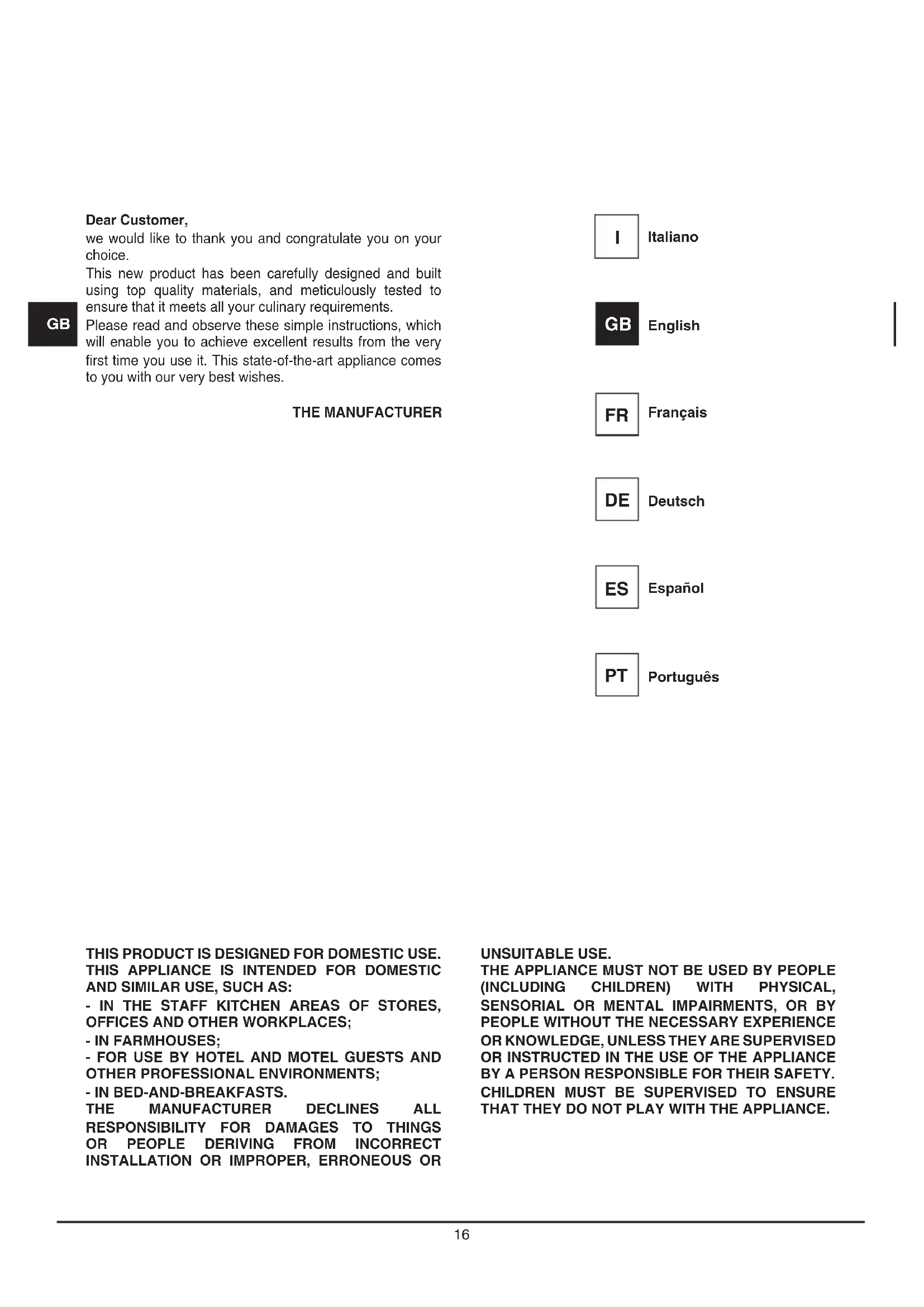 THAT THEY DO NOT PLAY WITH THE APPLIANCE. Dear Customer, we would like to thank you and congratulate you on your choice. This new product has been carefully designed and built using top quality materials, and meticulously tested to ensure that it meets all your culinary requirements. Please read and observe these simple instructions, which will enable you to achieve excellent results from the very first time you use it. This state-of-the-art appliance comes to you with our very best wishes. THE MANUFACTURER Italiano
