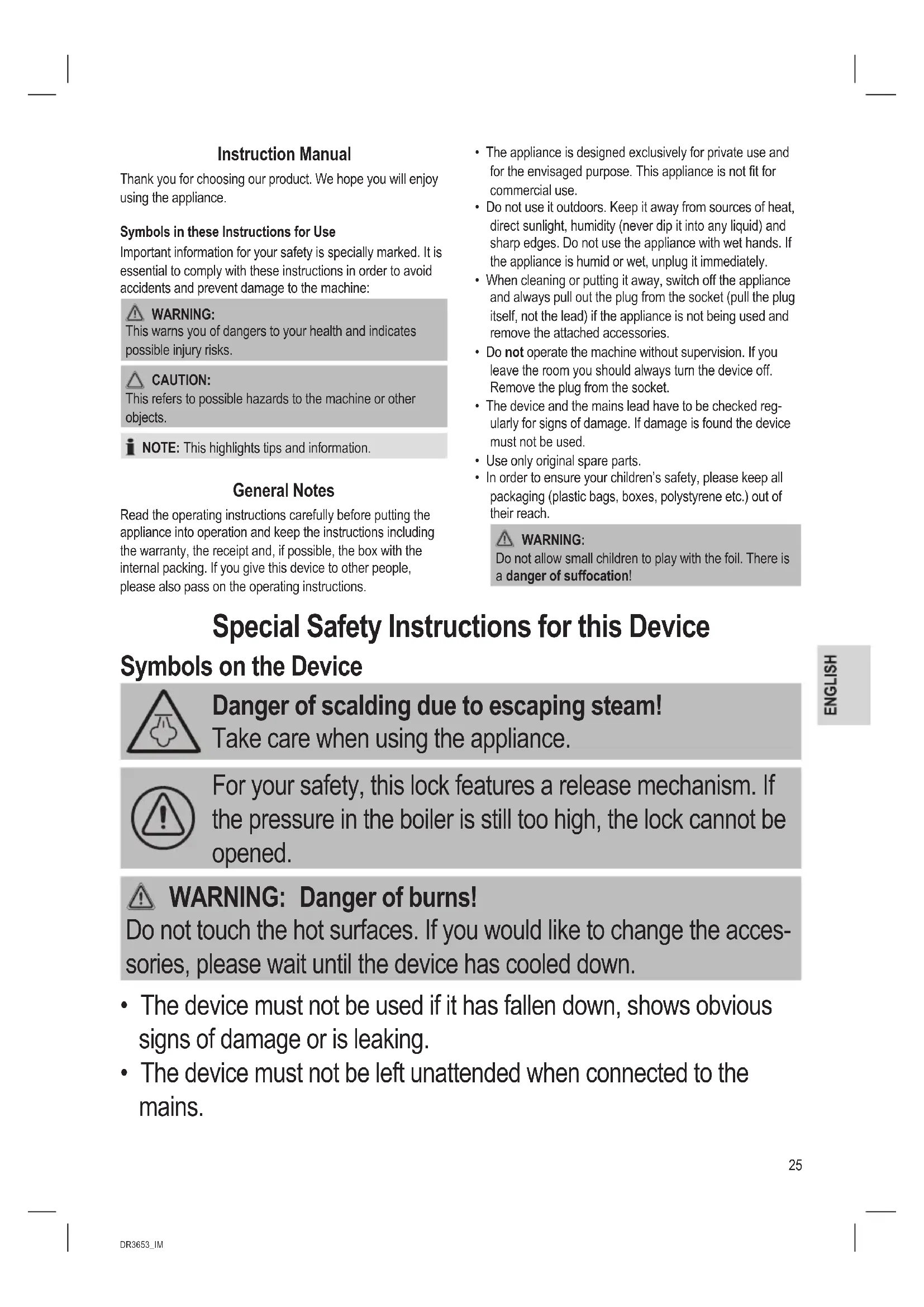 Do not allow small children to play with the foil. There is a danger of suffocation! Special Safety Instructions for this Device Symbols on the Device Danger of scalding due to escaping steam! Take care when using the appliance. For your safety, this lock features a release mechanism. If the pressure in the boiler is still too high, the lock cannot be opened.