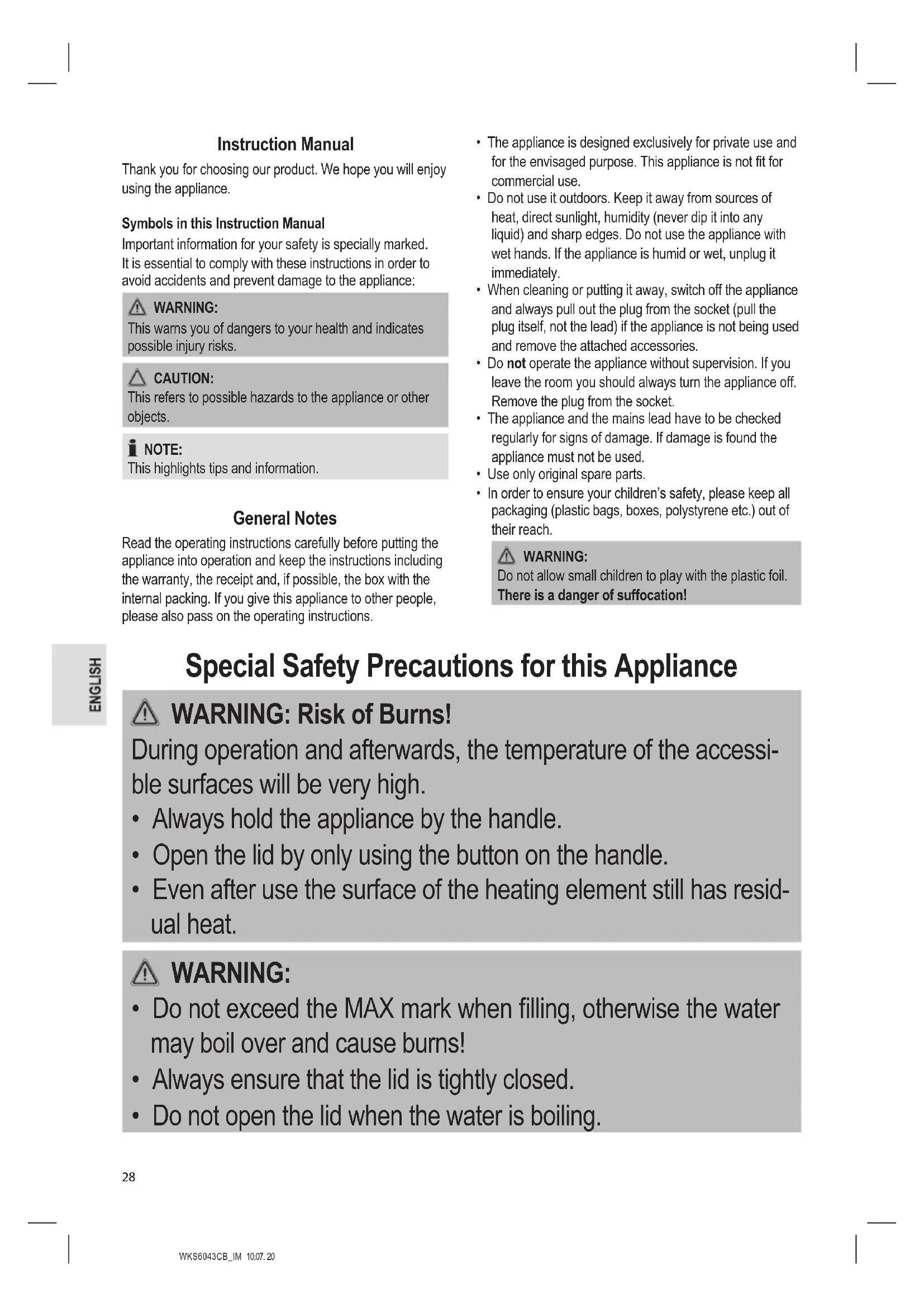 - This appliance is used for heating and boiling water. Never use to heat up other uids or foodstuffs. This can cause injury.WKS6043CB_IM 10.07. 20