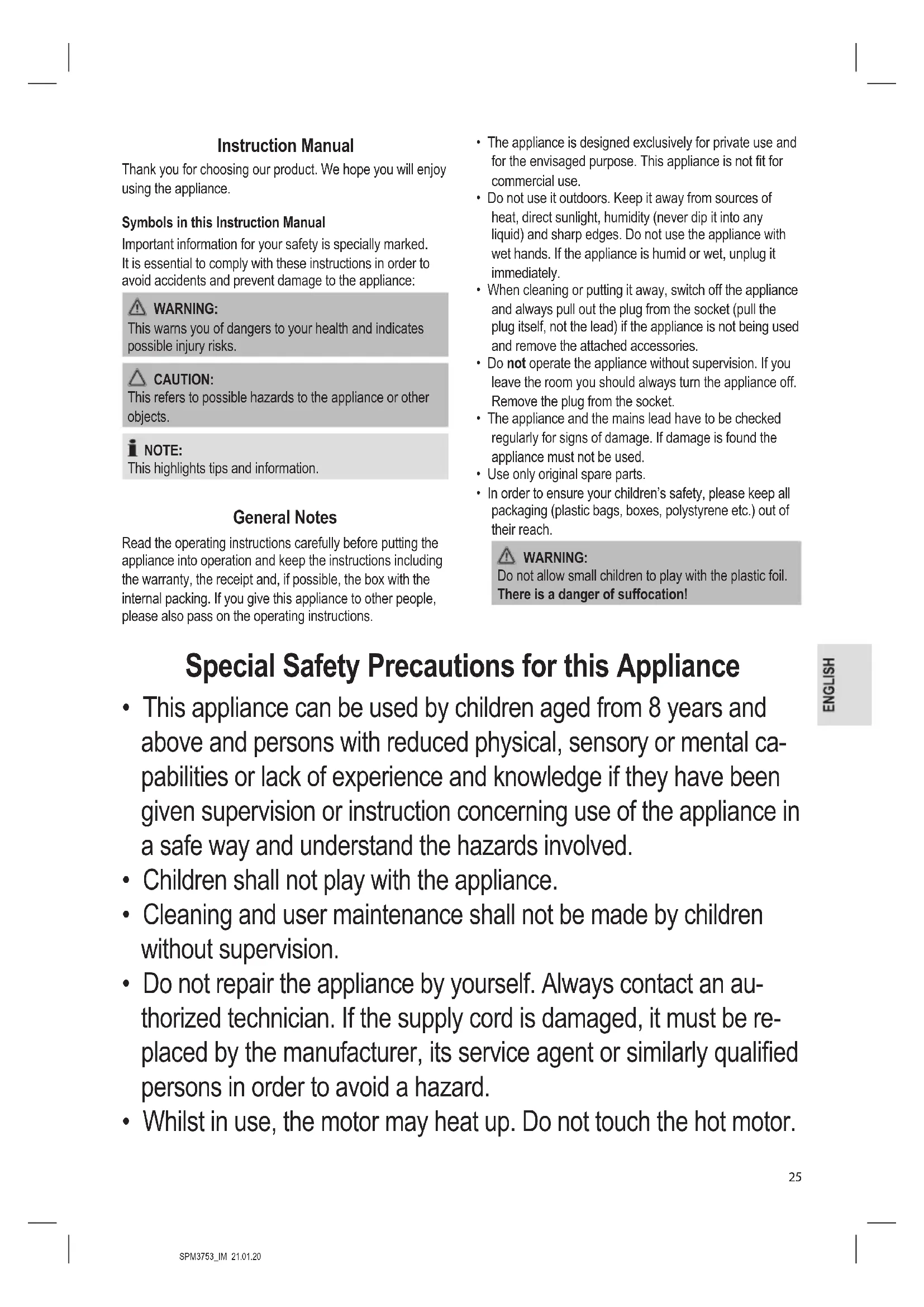 - Whilst in use, the motor may heat up. Do not touch the hot motor.SPM3753_IM 21.01.20
