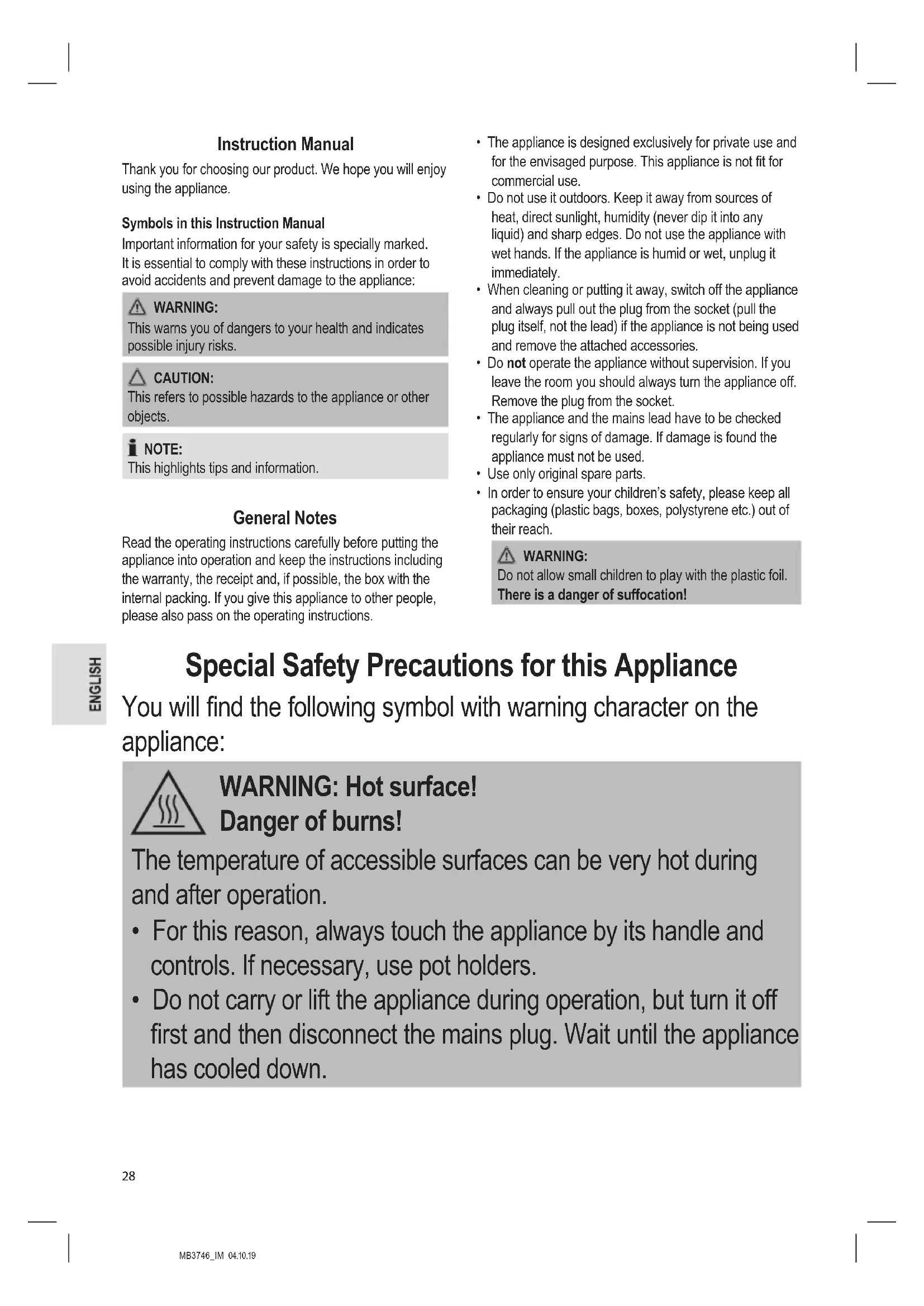 This appliance has been tested according to all relevant current CE guidelines, such as electromagnetic compatibility and low voltage directives, and is manufactured according to the latest safety regulations. Disposal Meaning of the “Dustbin” Symbol Protect our environment: do not dispose of electrical equipment in the domestic waste. Please return any electrical equipment that you will no longer use to the collection points provided for their disposal. This helps avoid the potential effects of incorrect disposal on the environment and human health. This will contribute to the recycling and other forms of re-utilisation of electrical and electronic equipment. Information concerning where the equipment can be disposed of can be obtained from your local authority.MB3746_IM 04.10.19