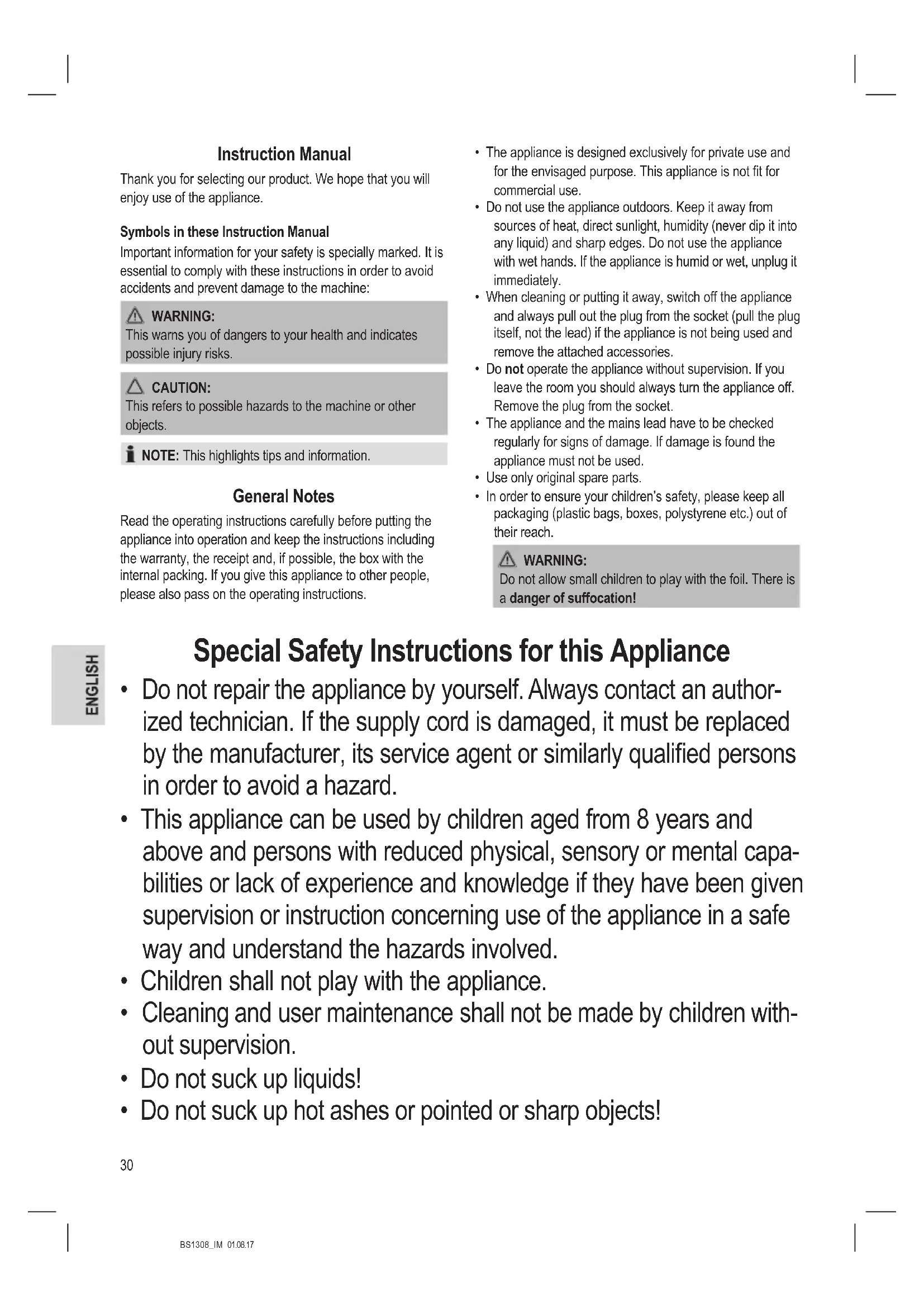 - Do not suck up hot ashes or pointed or sharp objects!31 BS1308_IM 01.08.17