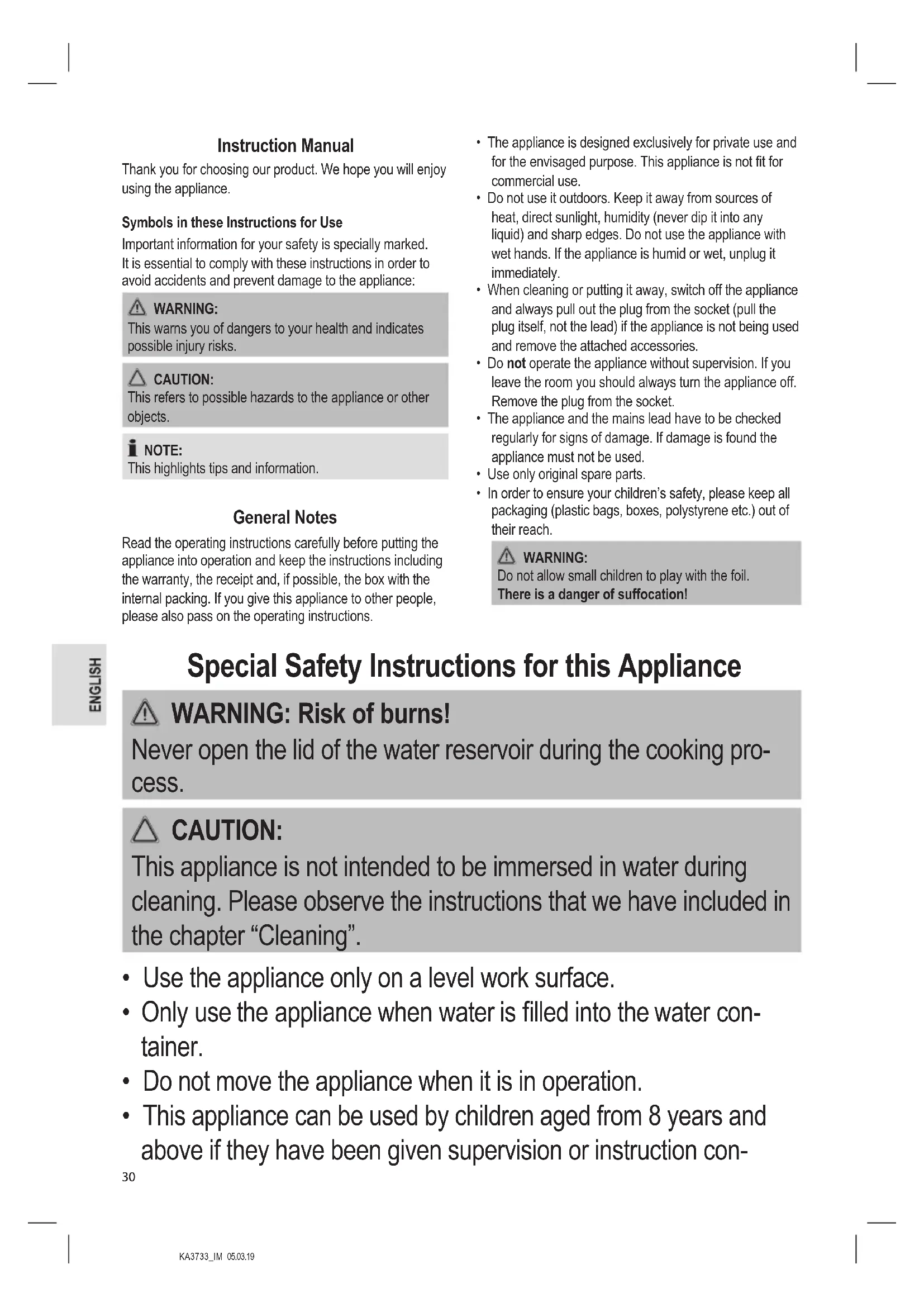 Never open the lid of the water reservoir during the cooking pro- cess. CAUTION: This appliance is not intended to be immersed in water during cleaning. Please observe the instructions that we have included in the chapter “Cleaning”.