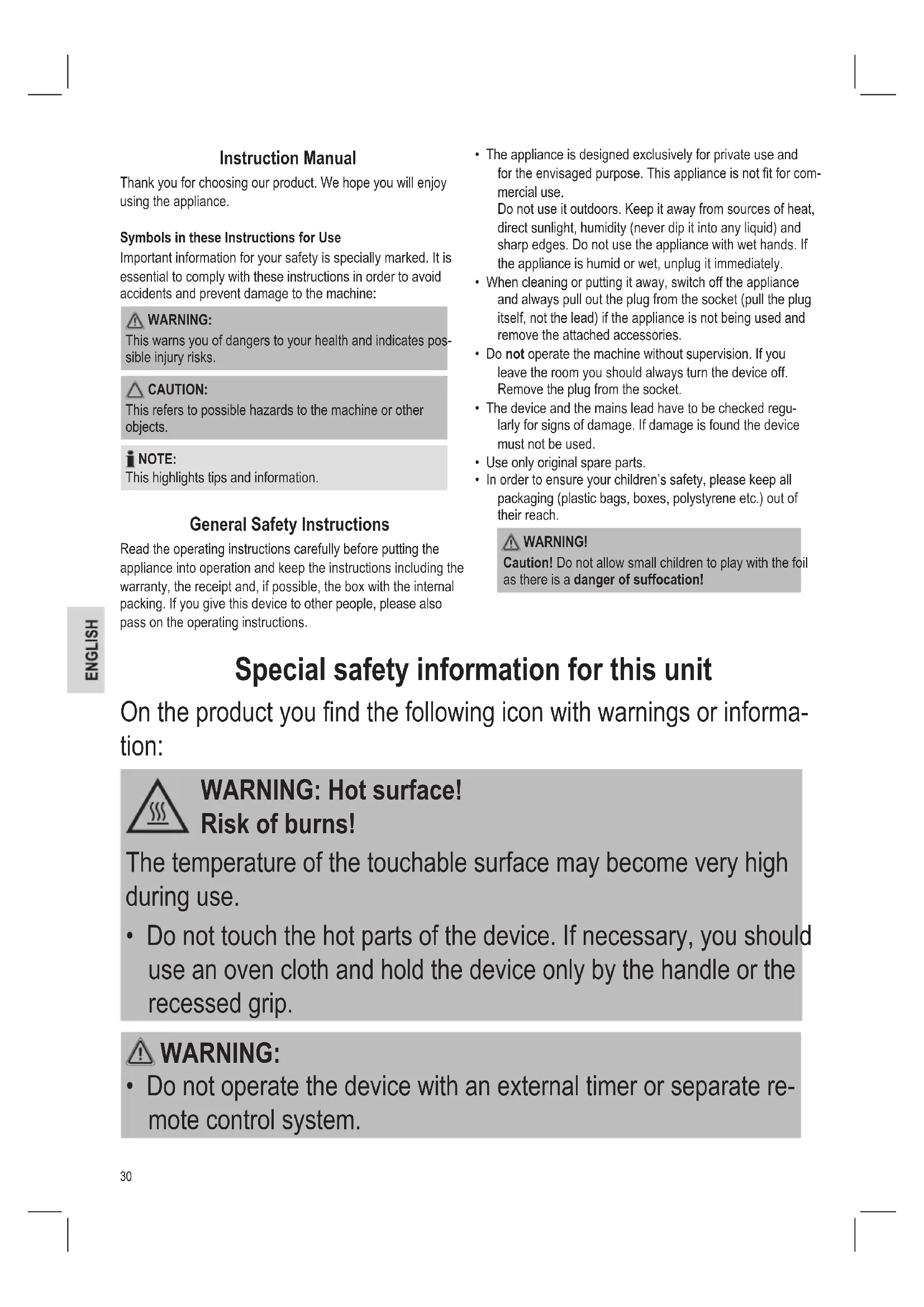 - In order to ensure your children’s safety, please keep all packaging (plastic bags, boxes, polystyrene etc.) out of their reach. WARNING! Caution! Do not allow small children to play with the foil as there is a danger of suffocation! Special safety information for this unit On the product you nd the following icon with warnings or informa- tion: