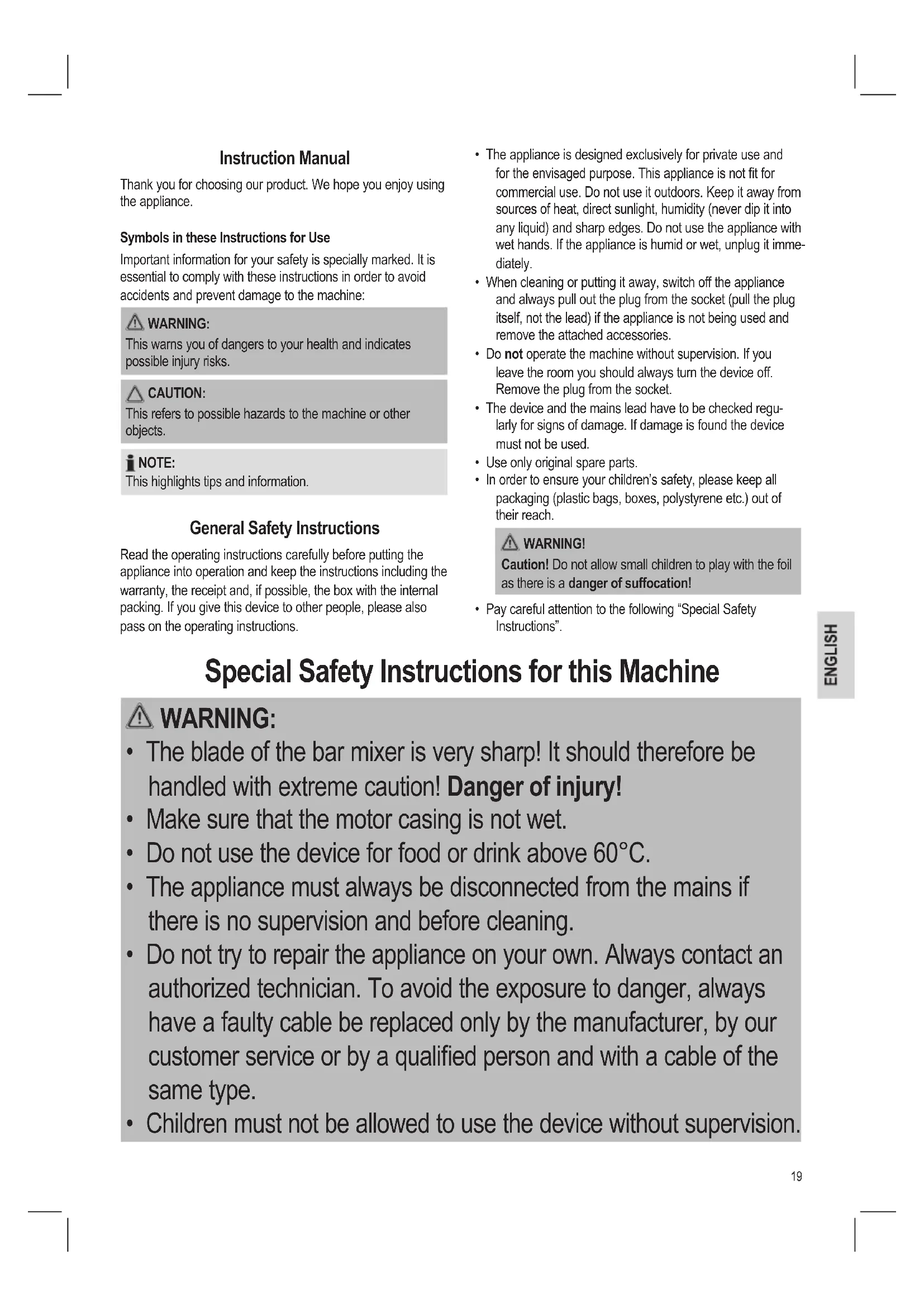 - The blade of the bar mixer is very sharp! Danger of injury! CAUTION:
