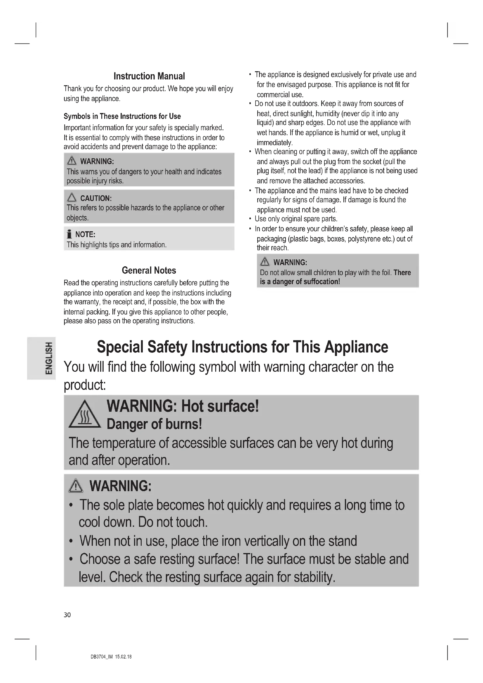 - Clean the sole plate and the rest with a slightly damp cloth. Technical Data Model:........................................................................DB 3704 Power supply:.....................................220 - 240 V~, 50 - 60 Hz Power consumption: ........................................ 1800 - 2200 W Protection class: ..................................................................... Net weight: ..................................................... approx. 0.85 kg The right to make technical and design modications in the course of continuous product development remains reserved. This appliance has been tested according to all relevant current CE guidelines, such as electromagnetic compatibil- ity and low voltage directives, and has been constructed in accordance with the latest safety regulations. Disposal Meaning of the Symbol “Dustbin” Protect our environment; electrical appliances do not belong in household waste. Use the collection points for the disposal of electrical equipment and submit your electrical and electronic equipment to these points that you will no longer use. You help reduce the potential impact of incorrect disposal on the environment and human health. You contribute to recycling, and other forms of recycling of electrical and electronic equipment. Information concerning the disposal of appliances can be obtained from your local or municipal authorities.DB3704_IM 15.02.18