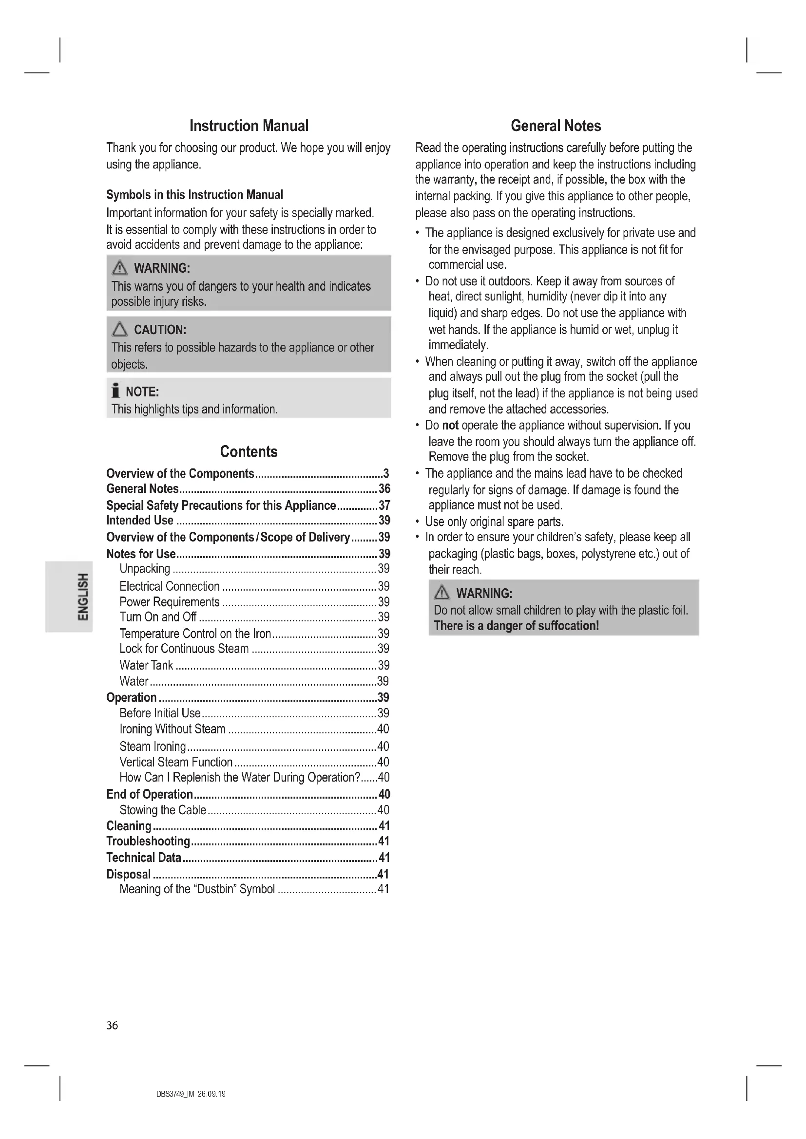 Loud noises during steam operation. The tank is empty. Check the tank. Fill tank with water. Initial start-up or after long periods of disuse. These noises of the pump are normal. Technical Data Model:..................................................................... DBS 3749 Power supply:.....................................220 - 240 V~, 50 - 60 Hz Power consumption: ........................................ 2200 - 2400 W Protection class: ..................................................................... Maximum lling quantity of the water tank: .............. 1.2 litres Net weight: ....................................................... approx. 2.3 kg The right to make technical and design modications in the course of continuous product development remains reserved. This appliance has been tested according to all relevant current CE guidelines, such as electromagnetic compatibility and low voltage directives, and is manufactured according to the latest safety regulations. Disposal Meaning of the “Dustbin” Symbol Protect our environment: do not dispose of electrical equipment in the domestic waste. Please return any electrical equipment that you will no longer use to the collection points provided for their disposal. This helps avoid the potential effects of incorrect disposal on the environment and human health. This will contribute to the recycling and other forms of re-utilisation of electrical and electronic equipment. Information concerning where the equipment can be dis- posed of can be obtained from your local authority.DBS3749_IM 26.09.19