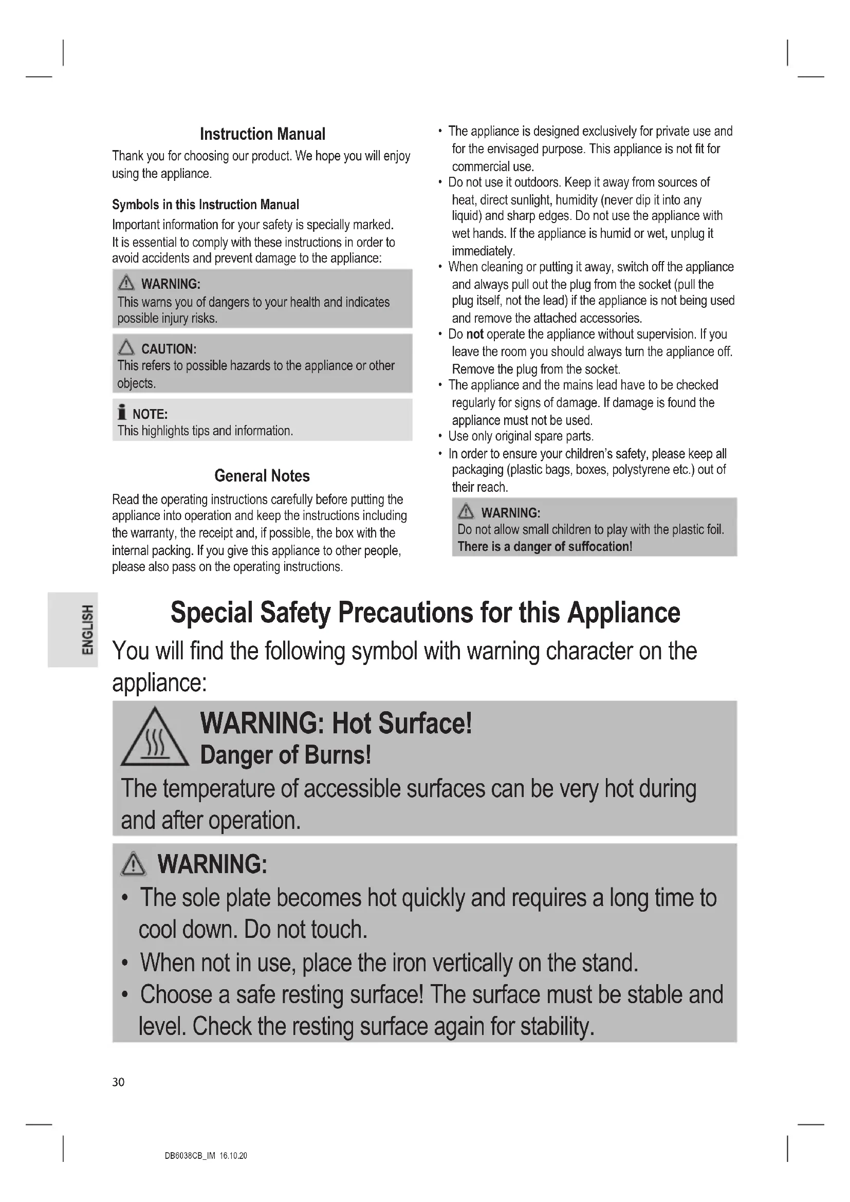 Do not allow small children to play with the plastic foil. There is a danger of suffocation! Special Safety Precautions for this Appliance You will nd the following symbol with warning character on the appliance: