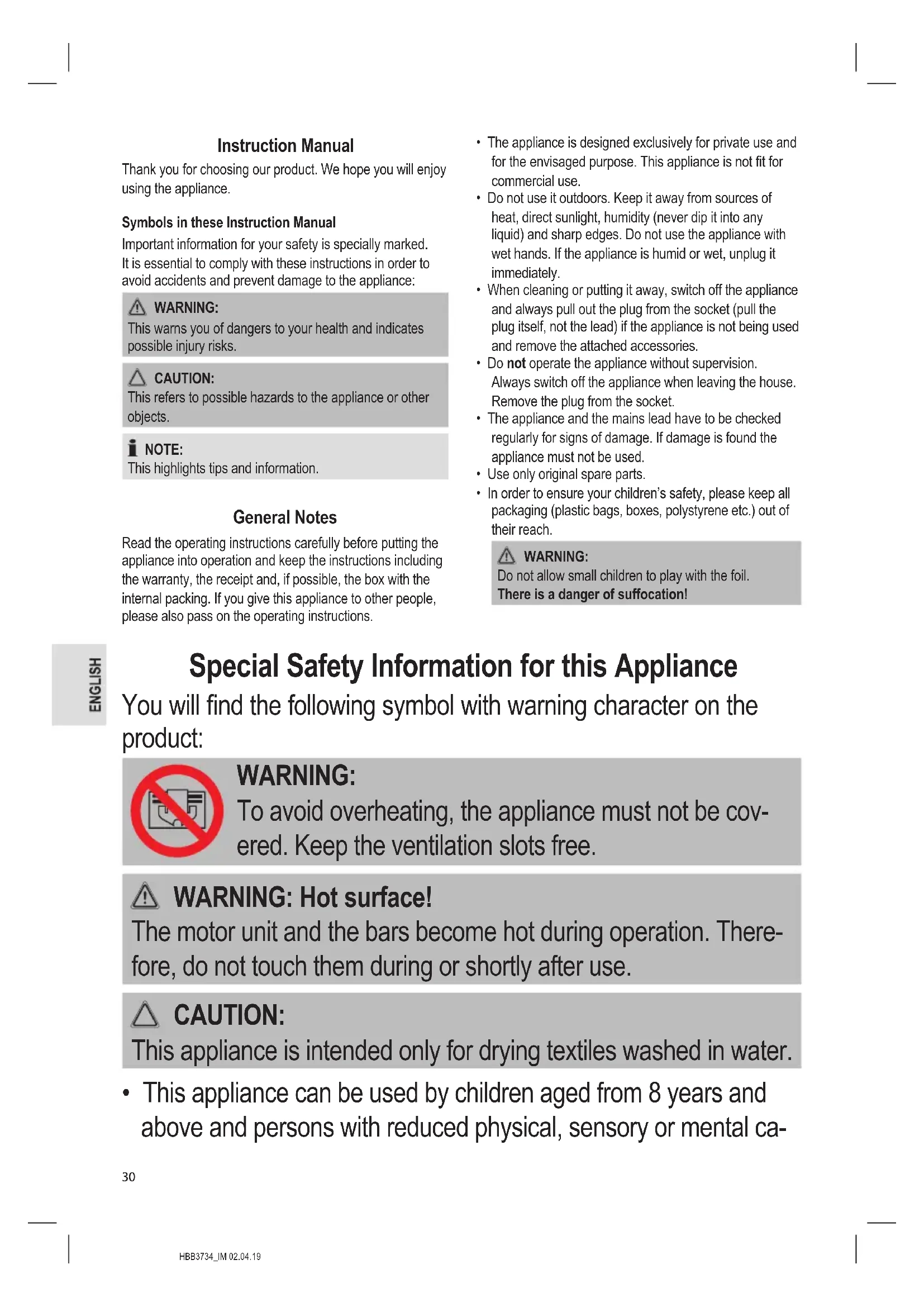 - This appliance can be used by children aged from 8 years and above and persons with reduced physical, sensory or mental ca-HBB3734_IM 02.04.19