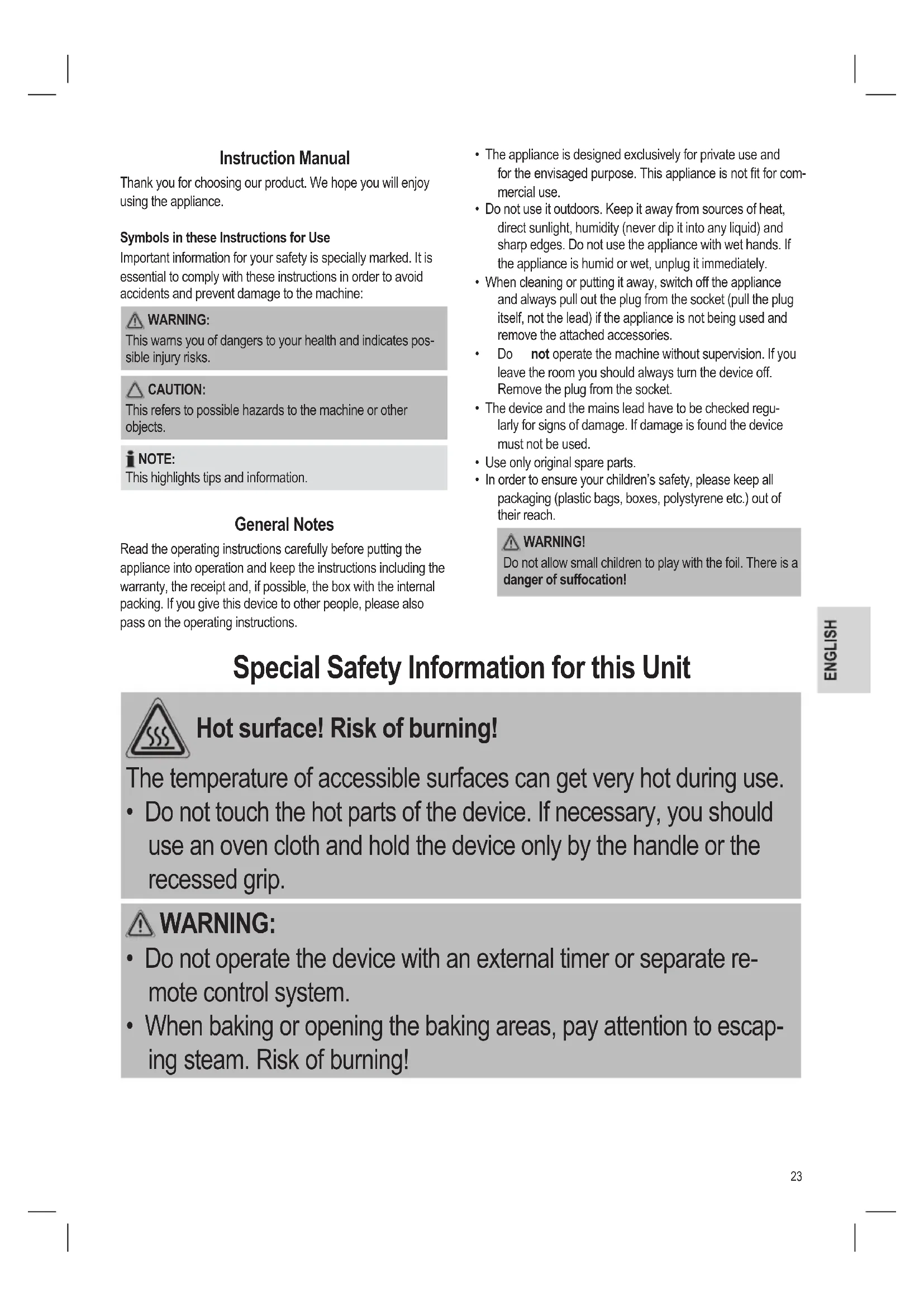 - In order to ensure your children’s safety, please keep all packaging (plastic bags, boxes, polystyrene etc.) out of their reach. WARNING! Do not allow small children to play with the foil. There is a danger of suffocation! Special Safety Information for this Unit Hot surface! Risk of burning! The temperature of accessible surfaces can get very hot during use.