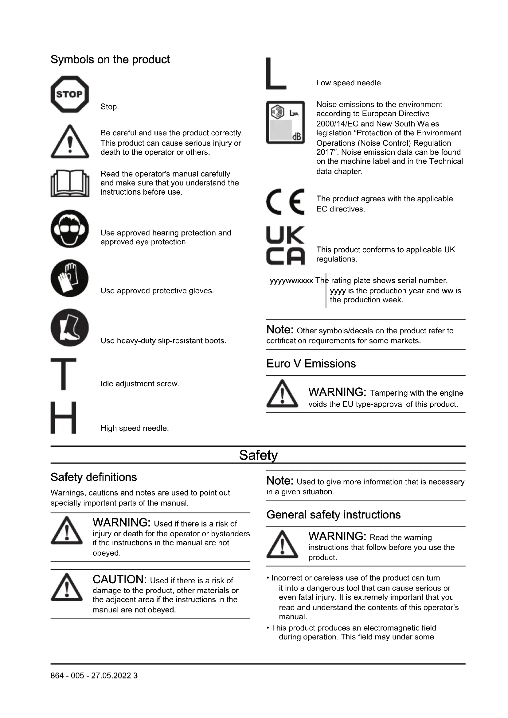 Product description The product is a hedge trimmer with a combustion engine. Intended use Use the product to cut branches and twigs. Do not use the product for other tasks. 2 864 - 005 - 27.05.2022Symbols on the product Stop. Be careful and use the product correctly. This product can cause serious injury or death to the operator or others. Read the operator's manual carefully and make sure that you understand the instructions before use. Use approved hearing protection and approved eye protection. Use approved protective gloves. Use heavy-duty slip-resistant boots. Idle adjustment screw. High speed needle. Low speed needle. Noise emissions to the environment according to European Directive 2000/14/EC and New South Wales legislation “Protection of the Environment Operations (Noise Control) Regulation 2017”. Noise emission data can be found on the machine label and in the Technical data chapter. The product agrees with the applicable EC directives. This product conforms to applicable UK regulations. yyyywwxxxx The rating plate shows serial number. yyyy is the production year and ww is the production week. Note: Other symbols/decals on the product refer to certification requirements for some markets. Euro V Emissions