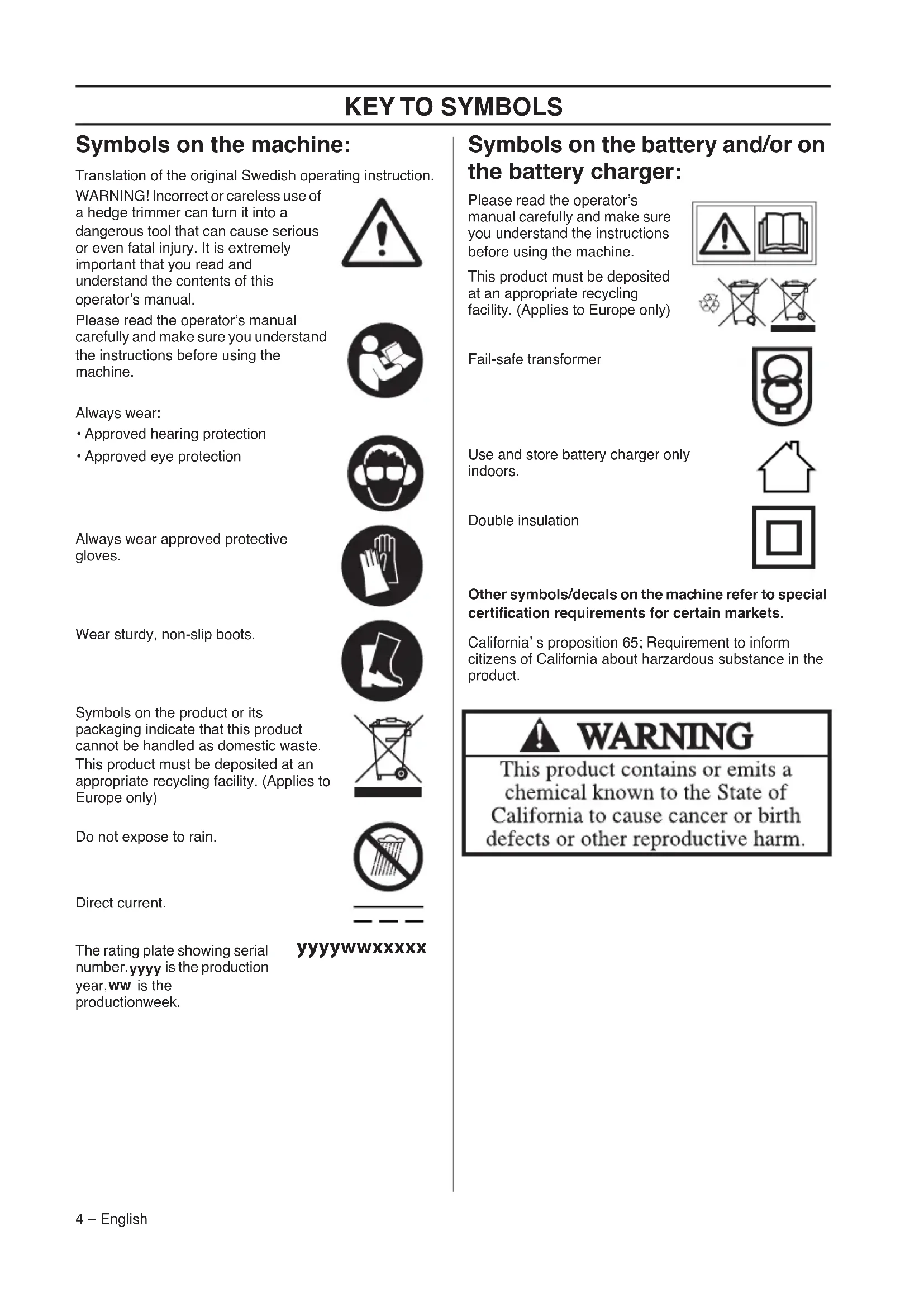 - Approved eye protection Always wear approved protective gloves. Wear sturdy, non-slip boots. Symbols on the product or its packaging indicate that this product cannot be handled as domestic waste. This product must be deposited at an appropriate recycling facility. (Applies to Europe only) Do not expose to rain. Direct current. The rating plate showing serial number. yyyy is the production year,