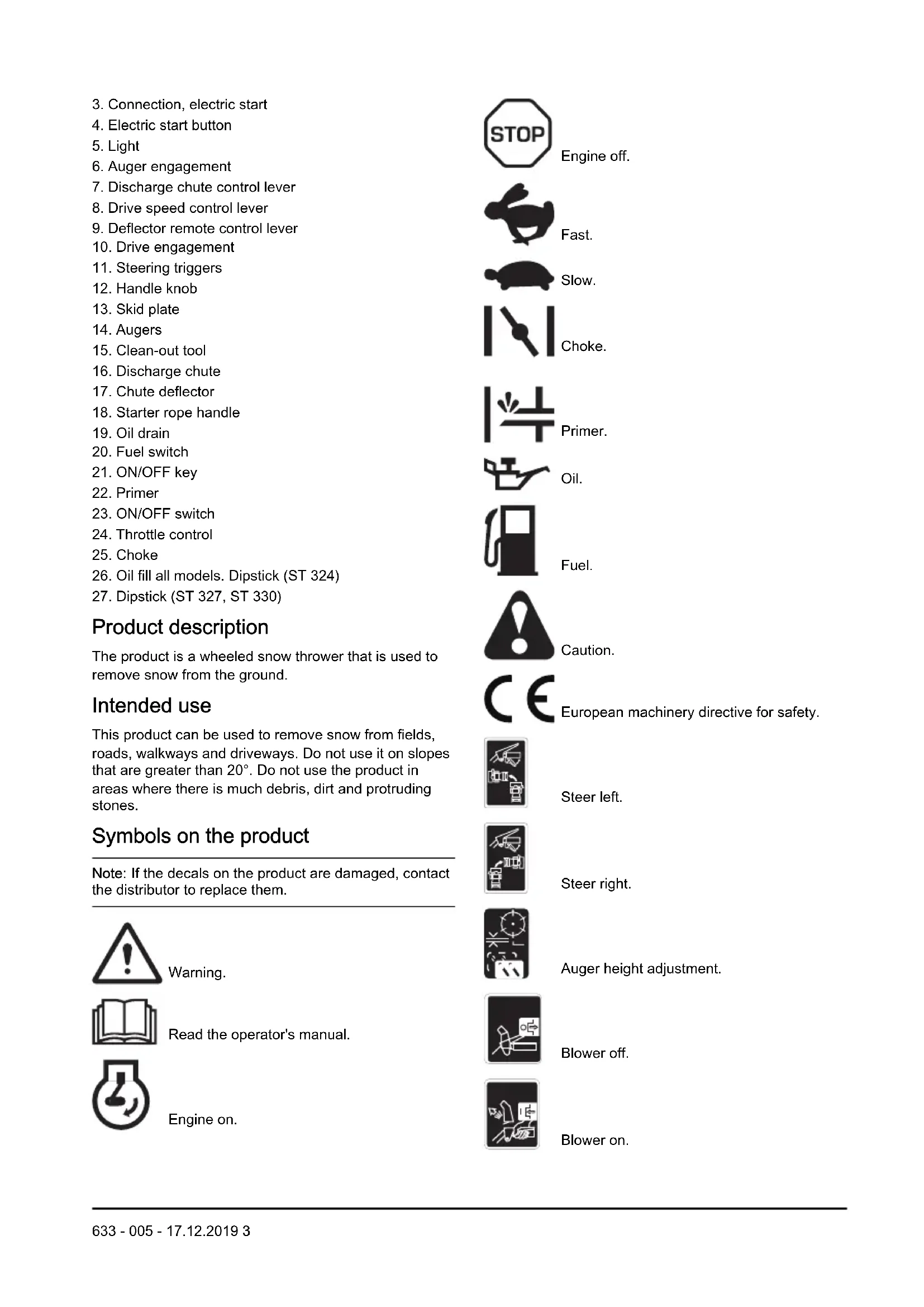 Product description The product is a wheeled snow thrower that is used to remove snow from the ground. Intended use This product can be used to remove snow from fields, roads, walkways and driveways. Do not use it on slopes that are greater than 20°. Do not use the product in areas where there is much debris, dirt and protruding stones. Symbols on the product Note: If the decals on the product are damaged, contact the distributor to replace them. Warning. Read the operator's manual. Engine on. Engine off. Fast. Slow. Choke. Primer. Oil. Fuel. Caution. European machinery directive for safety. Steer left. Steer right. Auger height adjustment. Blower off. Blower on.