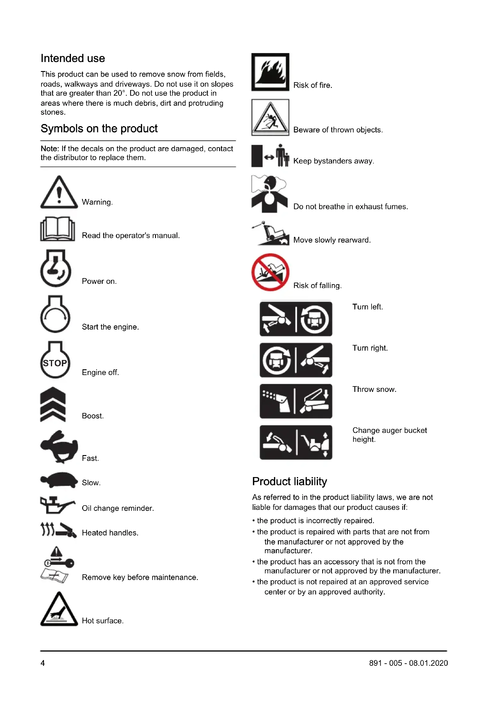 This product can be used to remove snow from fields, roads, walkways and driveways. Do not use it on slopes that are greater than 20°. Do not use the product in areas where there is much debris, dirt and protruding stones. Symbols on the product Note: If the decals on the product are damaged, contact the distributor to replace them. Warning. Read the operator's manual. Power on. Start the engine. STOP Engine off. Boost. Fast. Slow. Oil change reminder. Heated handles. Remove key before maintenance. Hot surface. Risk of fire. Beware of thrown objects. Keep bystanders away. Do not breathe in exhaust fumes. Move slowly rearward. Risk of falling. Turn left. Turn right. Throw snow. Change auger bucket height. Product liability As referred to in the product liability laws, we are not liable for damages that our product causes if: