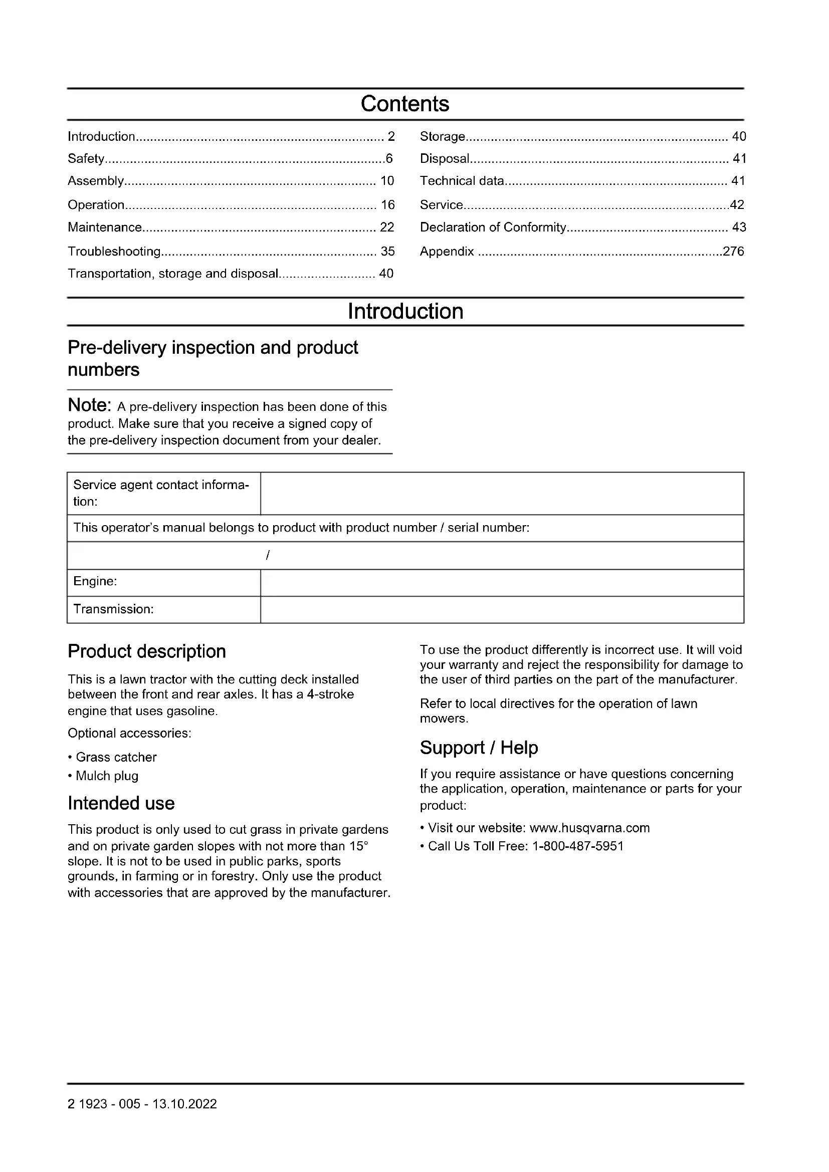 ft (1.5 m) then rearward for 5 ft (1.5 m). Do this procedure 3 times. Troubleshooting Problem Cause Action The engine does not start. There is no fuel in the fuel tank. Fill the fuel tank. The throttle control is not in the cor- rect position. Refer to the start instructions. The spark plug is defective. Replace the spark plug. The air filter is dirty. Clean or replace the air filter. The fuel filter is clogged. Replace the fuel filter. There is water in the fuel. Remove all fuel from the fuel tank and the carburetor. Fill the fuel tank with new fuel and replace the fuel fil- ter. The wires are loose or damaged. Do a check of all wires. The engine valves are not adjusted correctly. Speak to an approved service agent. The engine is flooded. Wait 2–3 minutes before you try to start the engine again. The fuel in the fuel tank is bad. Replace the fuel in the fuel tank. 1923 - 005 - 13.10.2022 35Problem Cause Action The starter motor does not turn the engine over. The battery is too weak. Charge the battery. The attachment clutch control is en- gaged. Disengage the attachment clutch control. The clutch/brake pedal is not pushed down fully. Push down the clutch/brake pedal fully when you start the engine. The connection at the cable connec- tors on the battery terminals is bad. Do a check of the battery connec- tions. The main fuse is defective. Replace the main fuse. The ignition lock is defective. Speak to an approved service agent. The safety connector for clutch/brake pedal is defective. Speak to an approved service agent. The starter motor or the solenoid is defective. Speak to an approved service agent. The operator presence control (OPC) is defective. Do a check of the wires, switches and connections. If not corrected, speak to an approved service agent. Do not operate product with a defec- tive operator presence control. The engine does not run smoothly. The spark plug is defective. Replace the spark plug. The carburetor is not adjusted cor- rectly. Speak to an approved service agent. The air filter is dirty. Clean or replace the air filter. The check valve on the fuel tank cap is defective. Replace the fuel tank cap. The fuel tank is almost empty. Fill the fuel tank with fuel. There is water in the fuel. Remove all fuel from the fuel tank and the carburetor. Fill the fuel tank with new fuel and replace the fuel fil- ter. The choke is engaged and the en- gine is warm. Disengage the choke. The fuel mix or fuel type is incorrect. Remove all fuel from the fuel tank and the carburetor. Fill the fuel tank with the correct fuel mix or fuel type. The fuel filter is clogged Replace the fuel filter. The spark plug is defective. Replace the spark plug. There is dirt in the carburetor or fuel line. Clean the carburetor and fuel lines. 36 1923 - 005 - 13.10.2022Problem Cause Action The engine becomes too hot. There is overload in the engine. Decrease the workload. The air intake or the cooling fins on the engine are blocked. Clean the air intake and the cooling fins on the engine. The cooling fan is defective. Speak to an approved service agent. The engine oil level is too low. Do a check of the engine oil level. Fill with engine oil if it is necessary. The ignition lock is defective. Speak to an approved service agent. The spark plug is defective. Replace the spark plug. There is loss of power. The product is operated at too high forward or rearward speed when you cut grass. Use slower speed. The throttle control is in the choke position. Put the throttle control in the fast po- sition. There is build-up of grass, leaves or unwanted material under the cutting deck. Clean the cutting deck. The air filter is dirty. Clean or replace the air filter. The engine oil level is too low. Do a check of the engine oil level. Fill with engine oil if it is necessary. The engine oil is dirty. Replace the engine oil. The spark plug is defective. Replace the spark plug. The fuel filter is dirty. Replace the fuel filter. The fuel in the fuel tank is bad. Replace the fuel in the fuel tank. There is water in the fuel. Remove all fuel from the fuel tank and the carburetor. Fill the fuel tank with new fuel and replace the fuel fil- ter. The spark plug wire is loose. Connect and tighten the spark plug wire. The air intake or the cooling fins on the engine are blocked. Clean the air intake and the cooling fins on the engine. The muffler is clogged or damaged. Clean or replace the muffler. There is loose or damaged wiring. Do a check of all wiring. The engine valves are not adjusted correctly. Speak to an approved service agent. There is vibration in the product. The blades are loose. Tighten bolts on the blades. One or more of the blades are dam- aged or not balanced. Balance the blades or replace the blades. The engine is loose. Tighten the engine bolts. 1923 - 005 - 13.10.2022 37Problem Cause Action The battery does not charge. The main fuse is defective. Replace the main fuse. The battery is defective. Replace the battery. The charging cable is disconnected. Connect the charging cable. The connection at the cable connec- tors on the battery terminals is bad. Do a check of the battery connec- tions. The engine operates when the oper- ator gets up from the seat when the cutting deck is engaged. The operator presence control (OPC) is defective. Do a check of the wires, switches and connections. If not corrected, speak to an approved service agent. Do not operate product with a defec- tive operator presence control. The blades cannot rotate. There is blockage in the clutch mech- anism. Remove the blockage. The drive belt for the cutting deck is worn or damaged. Replace the drive belt for the cutting deck. An idler pulley is frozen. Replace the idler pulley. A blade mandrel is frozen. Replace the blade mandrel. Defective grass discharge. The engine speed is too slow. Put the throttle control in the fast po- sition. The product is operated at too high forward or rearward speed. Use slower speed. The grass is wet. Let the