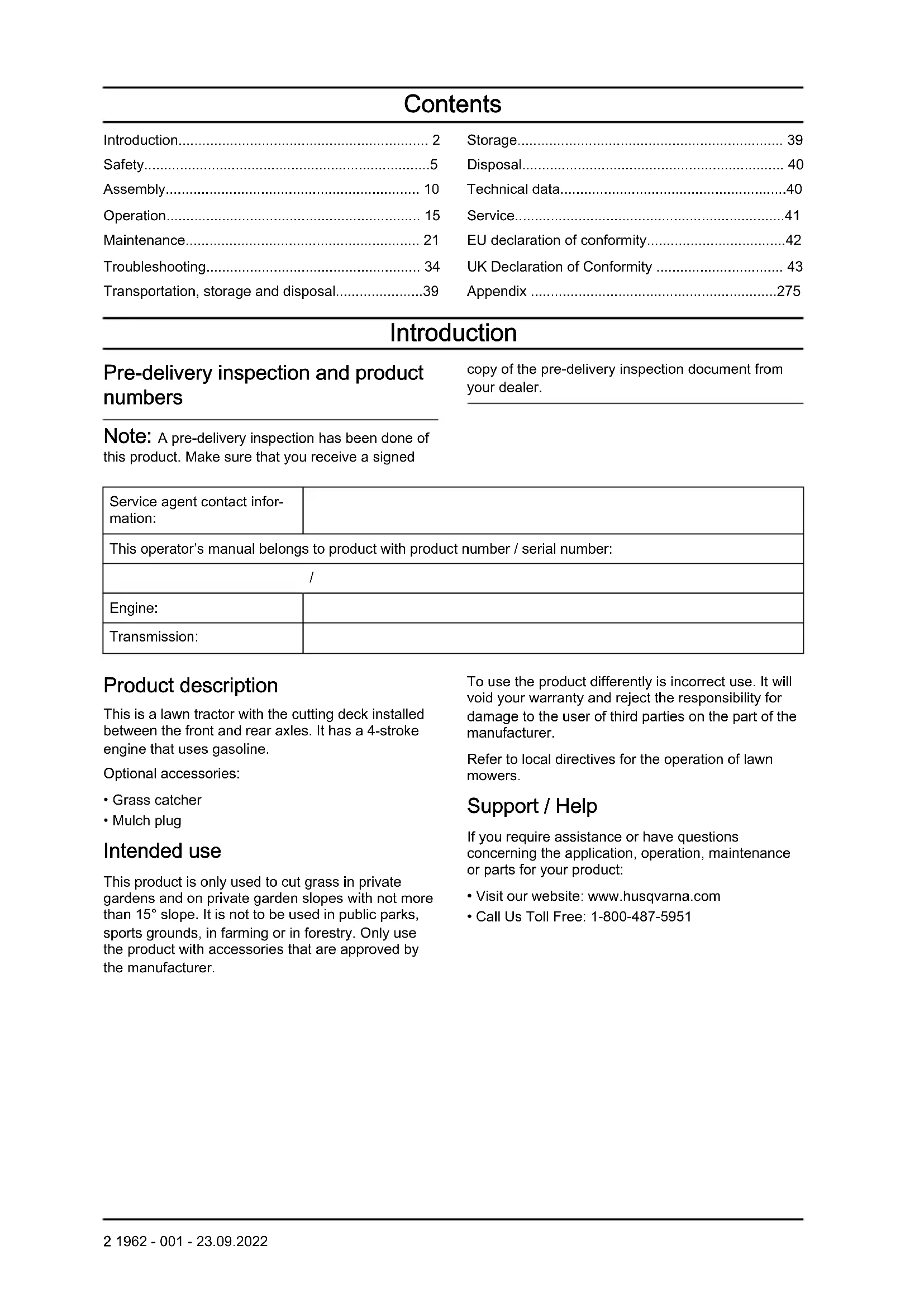 1962 - 001 - 23.09.2022 41EU declaration of conformity We, Husqvarna AB, SE 561 82 Huskvarna, SWEDEN, declare under our sole responsibility that the represented product: Description Combustion-engine-powered ride-on lawn mower with seated operator Brand Husqvarna Platform / Type / Model TC 238TX Batch Serial number dating 2021 and onwards complies fully with the following EU directives and regulations: Directive/Regulation Description 2006/42/EC “relating to machinery” 2011/65/EU “restriction of use of certain hazardous substances” 2014/30/EU “relating to electromagnetic compatibility” 2000/14/EC, 2005/88/EC “relating to outdoor noise” Harmonized standards and/or technical specifications applied are as follows: EN ISO
