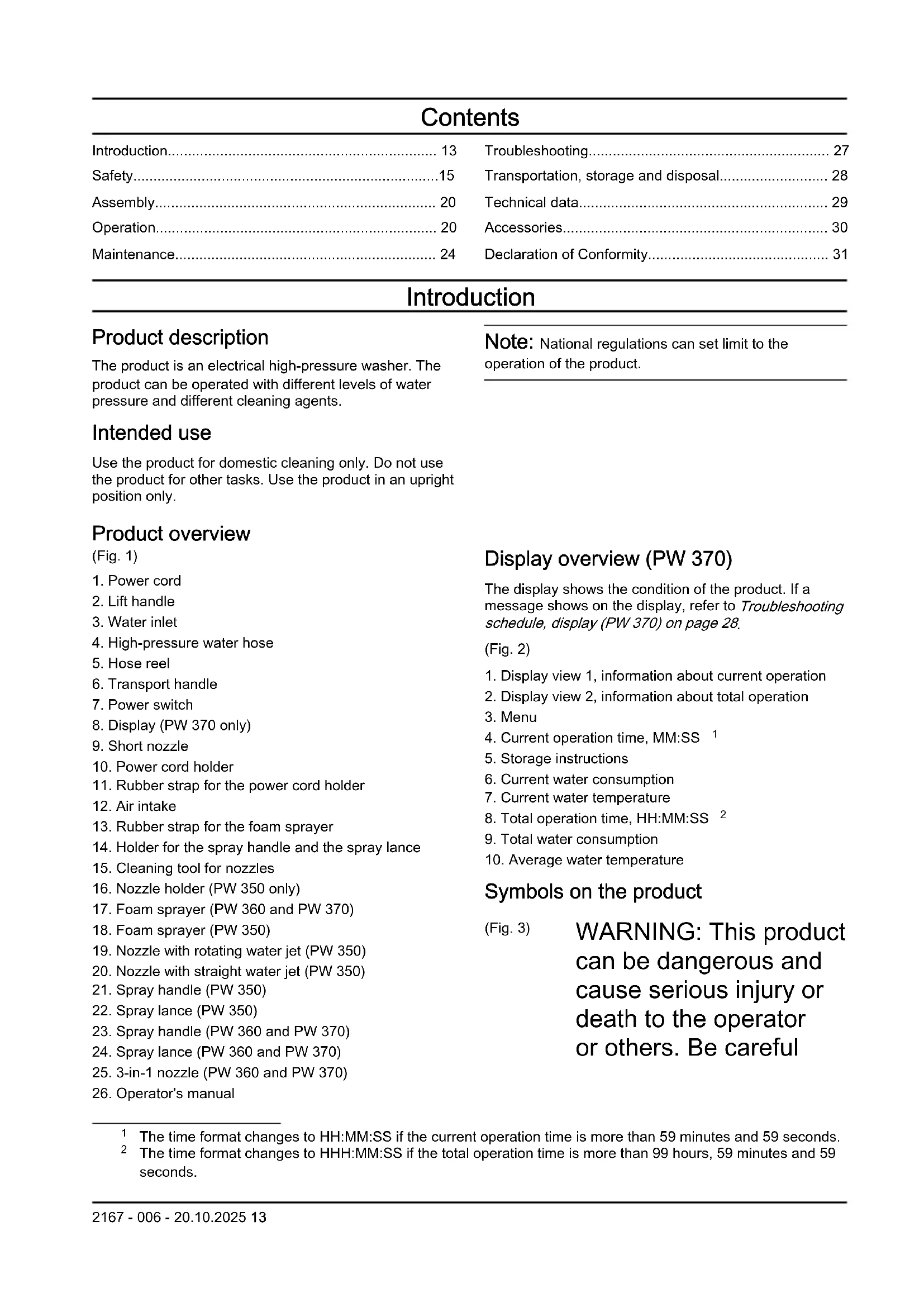 The time format changes to HHH:MM:SS if the total operation time is more than 99 hours, 59 minutes and 59 seconds. 2167 - 006 - 20.10.2025 13and use the product correctly. (Fig. 4) Read the operator's manual carefully and make sure that you understand the instructions before you use this product. (Fig. 5) The product is not suitable for connection to the potable water mains. (Fig. 6) High-pressure water jets can be dangerous if subject to misuse. The jet must not be directed at persons, electrical equipment or the product. (Fig. 7) Environmental mark. The product or package of the product is not domestic waste. Recycle it at an approved disposal location for electrical and electronic equipment. (Fig. 8) Class II tool. (Fig. 9) Noise emission to the environment label as per EU and UK directives and regulations, and New South Wales legislation "Protection of the Environment Operations (Noise Control) Regulations 2017". The guaranteed sound power level of the product is specified in Technical data on page