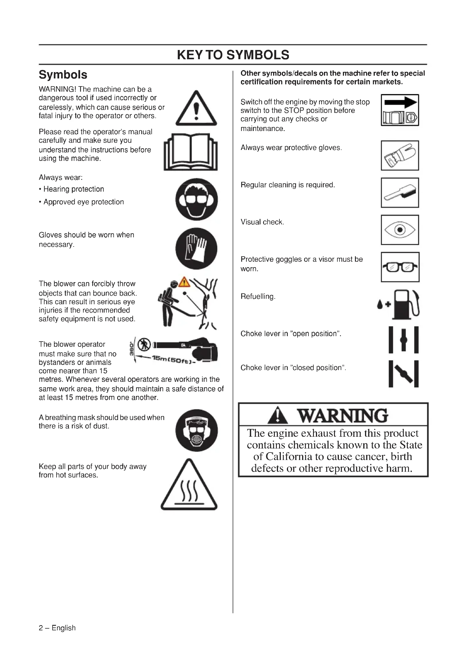 - Approved eye protection Gloves should be worn when necessary. The blower can forcibly throw objects that can bounce back. This can result in serious eye injuries if the recommended safety equipment is not used. The blower operator must make sure that no bystanders or animals come nearer than 15 metres. Whenever several operators are working in the same work area, they should maintain a safe distance of at least 15 metres from one another. A breathing mask should be used when there is a risk of dust. Keep all parts of your body away from hot surfaces. Other symbols/decals on the mac hine refer to special certification requirements for certain markets.
